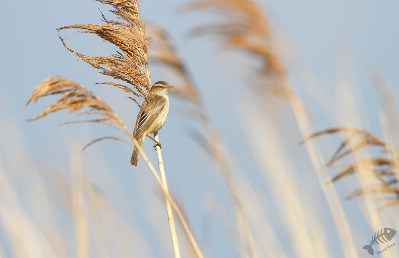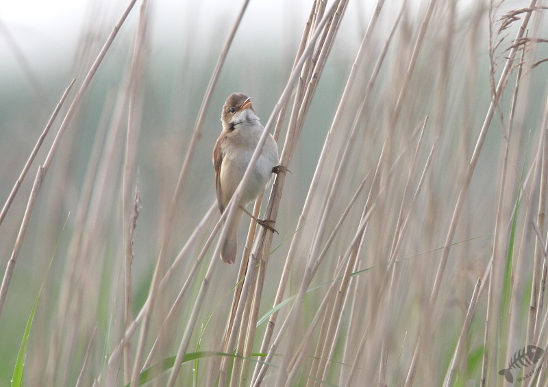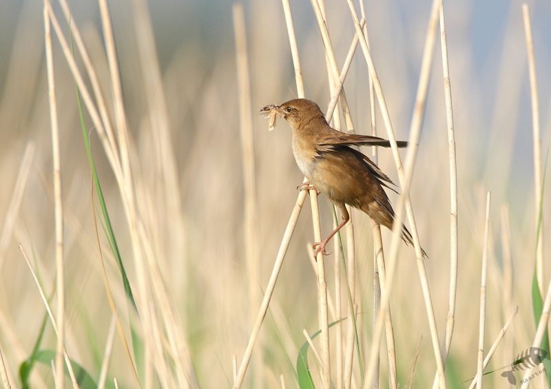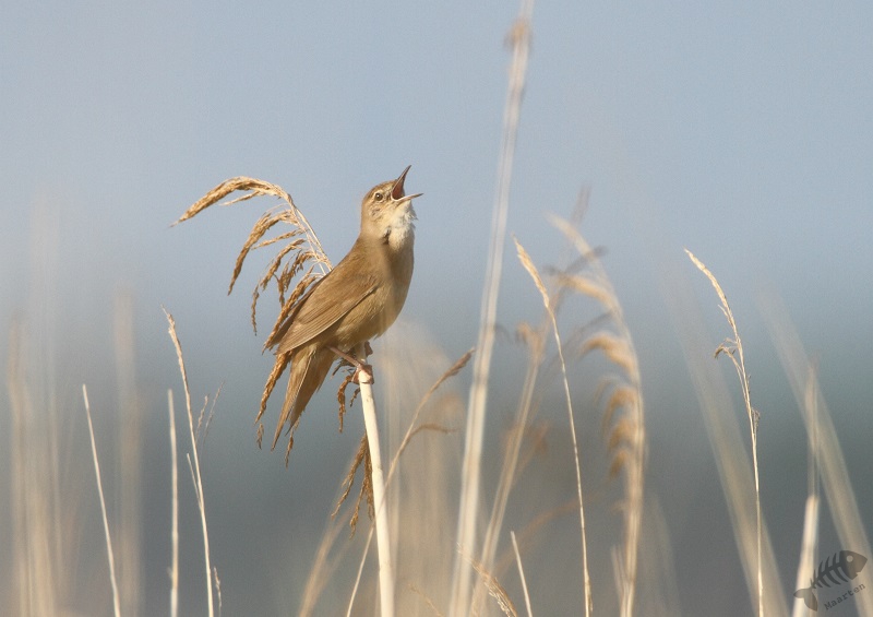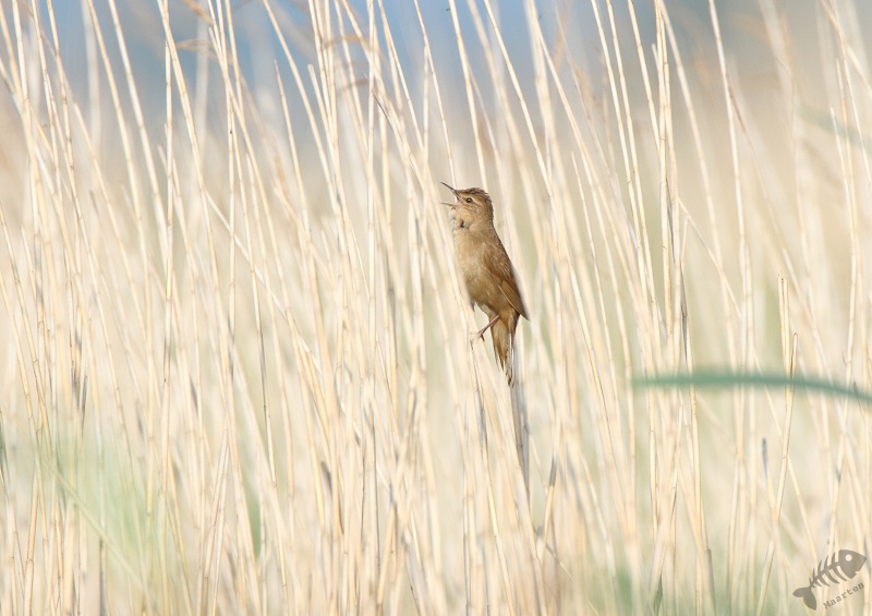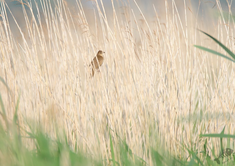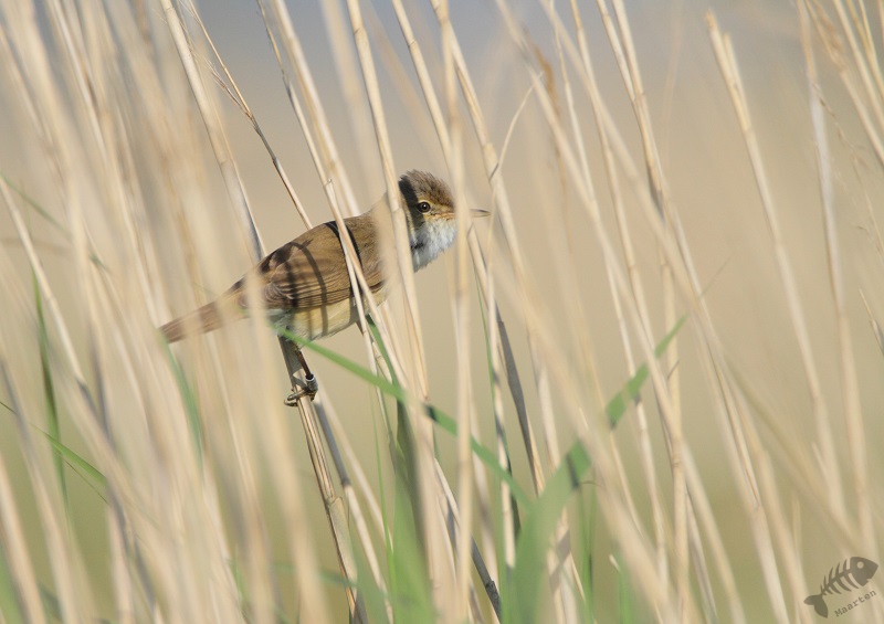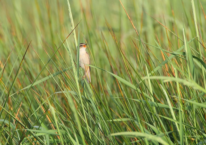 We zijn verder het gebied ingelopen en overal was wel iets te zien. Maar ineens hoorde ik het eerder genoemde monotone gesnor, en ben ik opzoek gegaan naar de maker. Zou het nu dan eindelijk eens gaan lukken? Al vrij snel vond ik de zanger, toch weer wat verborgen in het riet. Ik denk echter dat hij de zon ook voelde en hij kwam in eerste instantie mooi vrij te zitten en daarna deed hij precies waar ik al zo lang op had gehoopt: hij klom helemaal tot bovenin het riet en begon uit volle borst te ratelen! Hij draaide daarbij zijn kop zo karakteristiek alle kanten op, als een vuurtoren van geluid.