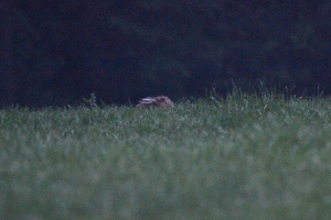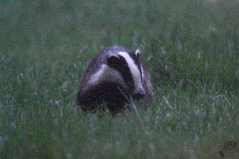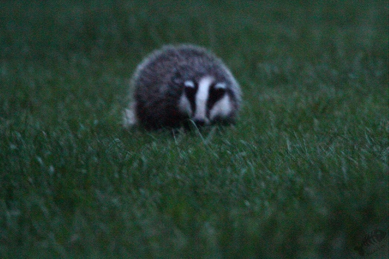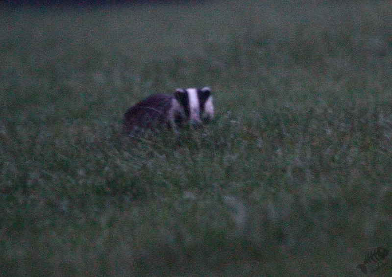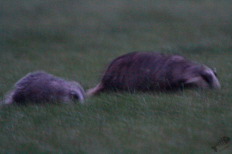 En inderdaad om ongeveer 5 voor 10 scharrelde er een Das het weiland op waar we stonden te wachten. Ik heb werkelijk alles uit m’n camera moeten halen om nog iets te kunnen fotograferen (voor de liefhebbers: Iso 6400, sluitertijd van 1/5s en diafragma 5.6 en met handmatig focussen (automatisch lukte al niet meer door het weinige licht)). Toen we daar zo bezig waren, kwam er vrij onverwacht een tweede exemplaar aanwaggelen die samen met de eerste optrok. Het verschil in grootte en kleur deed vermoeden dat het om een ouder en jong ging. Nog wat later kwamen er nog 2 dieren bij en waren we dus getuige van een hele familie Das die hun kostje aan het opscharrelen was op een steenworp afstand van Ede. Wat geweldig!