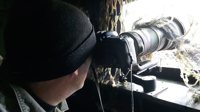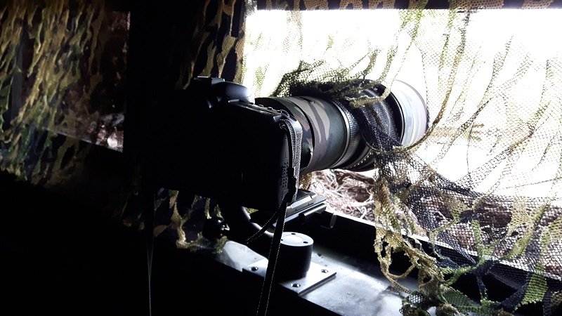 Bij aankomst was het in ieder geval droog en heb ik kleine beetjes voer op strategische plaatsen gelegd. Aan de setting heb ik niet veel gedaan, omdat ik hem prima vond zoals hij was. Ik ben toen in de hut gaan zitten, heb de deur achter me dichtgedaan en heb hem na een kleine 10 uur weer geopend.
