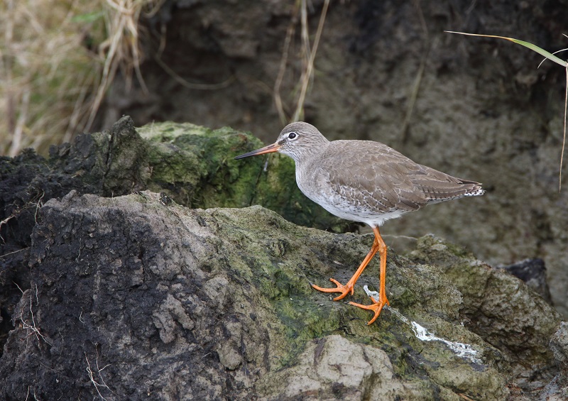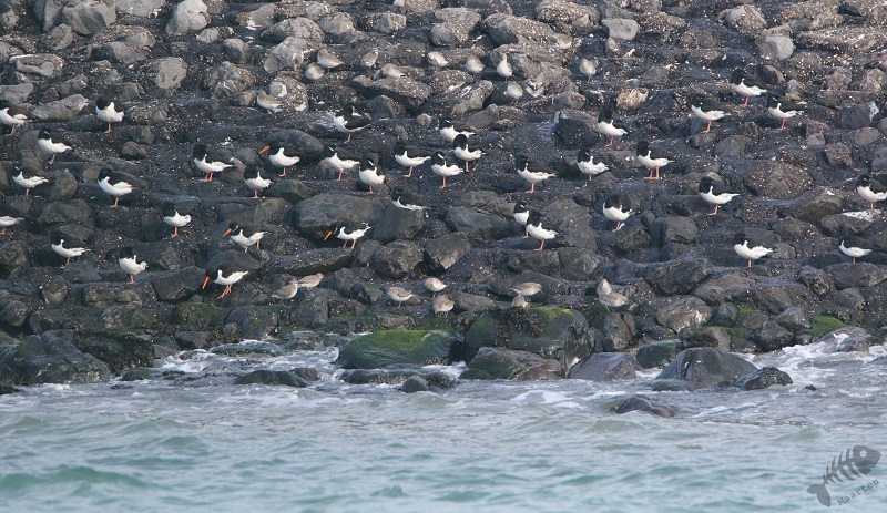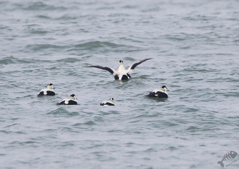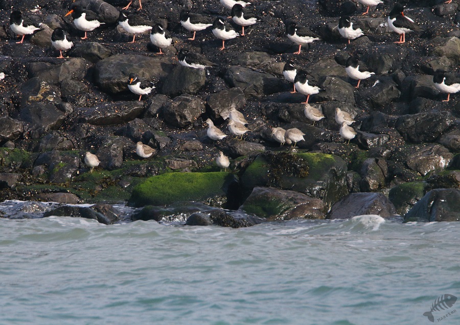 Bij de spuisluizen was het redelijk rustig. Alles zat wat verder op zee, behalve 2 Grijze Zeehonden die, ondanks de uitdrukkelijke waarschuwingen én het hoge hek, toch waren gaan zwemmen bij de sluis wat volgens de bordjes wel heel gevaarlijk is… Wat ik heel leuk vond was een groep Eiders, voornamelijk mannetjes, verderop het water. Ik had deze prachtige Eenden al een tijd niet gezien en nu kon ik weer eens genieten van hun prachtige kleuren. Ze voegden zich bij een groepje Middelste Zaagbekken en een IJseend wat een kleurrijk gezelschap opleverde. Op de basaltblokken streek een grote groep Scholeksters neer, later gevolgd door een groep die ik niet meteen kon thuisbrengen. Nu ik de foto’s wat beter heb bekeken is mijn conclusie dat het Kanoeten zijn. De oogstreep en langere snavel gaven de doorslag (en geen Bonte Strandlopers zoals ik eerst dacht).