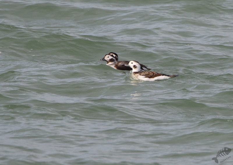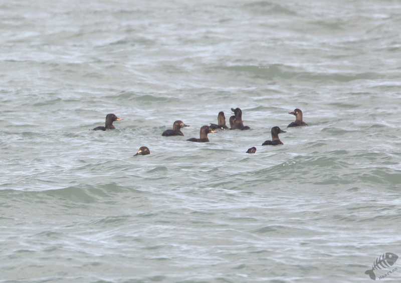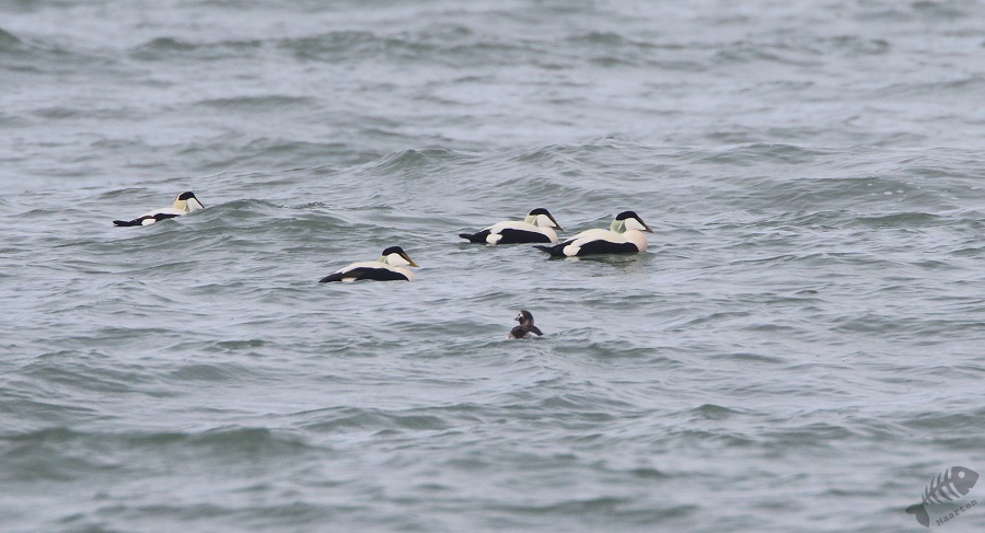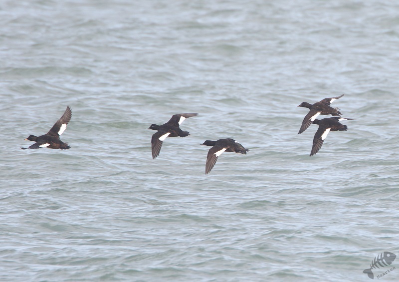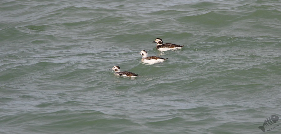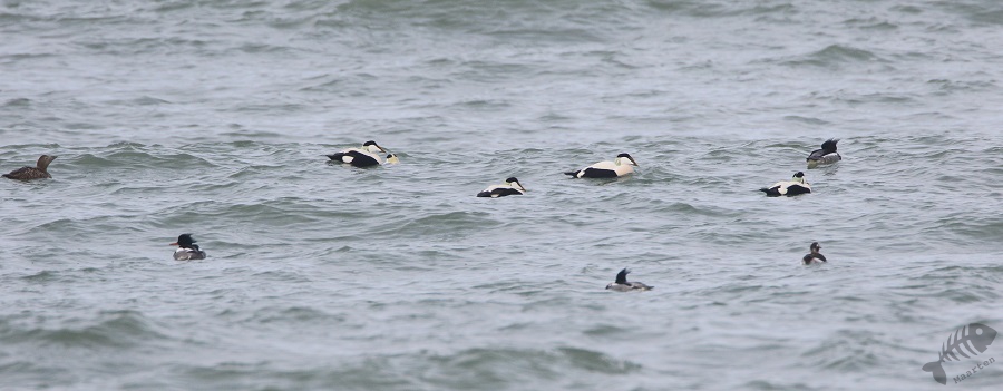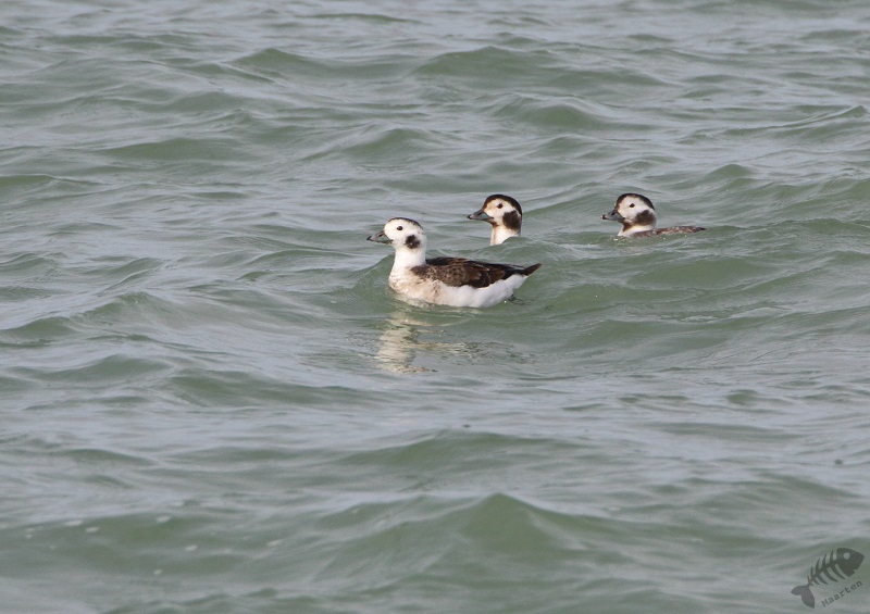 Op het stuk zee tussen het binnenhaventje en de spuisluizen, is het ook altijd interessant. Ook nu bleek er weer genoeg te zitten. Tot mijn grote blijdschap vloog er een vlucht Grote Zee-eenden rond en streek, wel wat verder, neer. Een nieuwe soort! Zeker in de vlucht bleken ze heel mooi, met hun witte spiegels als duidelijk kenmerk. Maar ook de gele snavel was herkenbaar. Wat gaaf! Er zwom ook nog een drie-tal IJseenden rond, waarvan ik denk dat het 3 vrouwtjes waren. Ze waren minder uitbundig gekleed en misten de lange staart. Mooi waren ze wel, maar stiekem vond ik het wel jammer dat er niet een mannetje tussen zwom. Ze zaten er wel heel mooi bij…