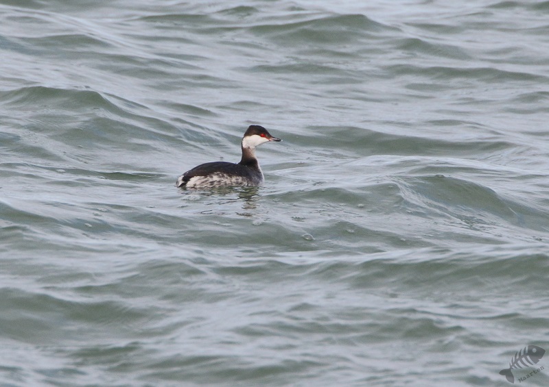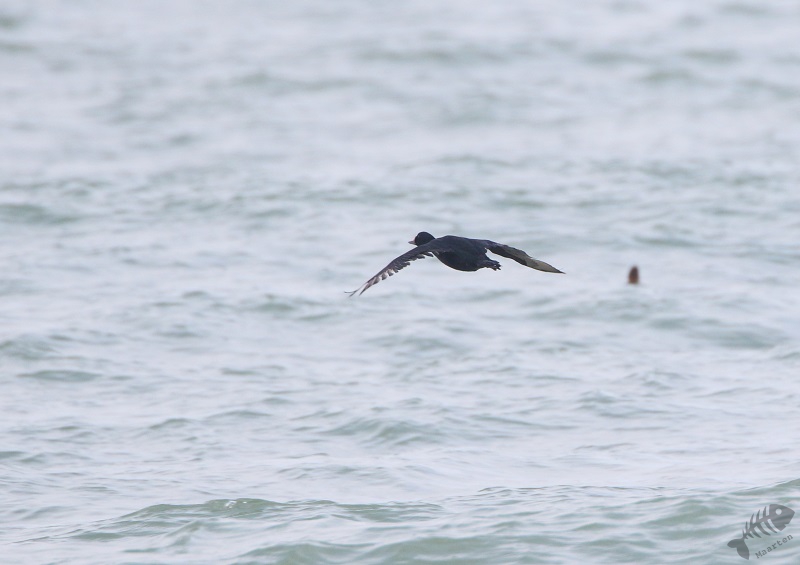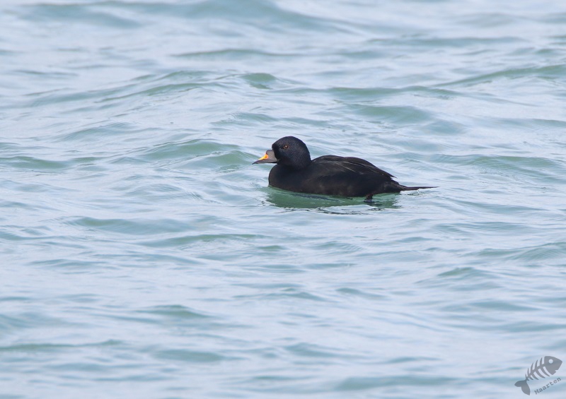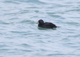 Het bleek laag water, wat de Kwade Hoek iets minder interessant maakte en met het opgelopen tijdverlies leek het beter door te rijden naar de Brouwersdam. Al direct bij het strekdammetje was het raak: er zwommen 2 Zwarte Zee-eenden rond, waarvan er 1 redelijk in de buurt bleef. Eerdere keren dat ik deze mooie Eend bij de Brouwersdam zag, zaten ze op grote afstand, De keer dat ik er ééntje dichtbij zag, had ik geen goede fotospullen bij me (Ameland). Nu waren de omstandigheden gecombineerd (dichtbij en de juiste spullen) en nagenoeg ideaal: ook het licht was behoorlijk gunstig, dus kreeg ik deze Zee-eend fraai afgebeeld.