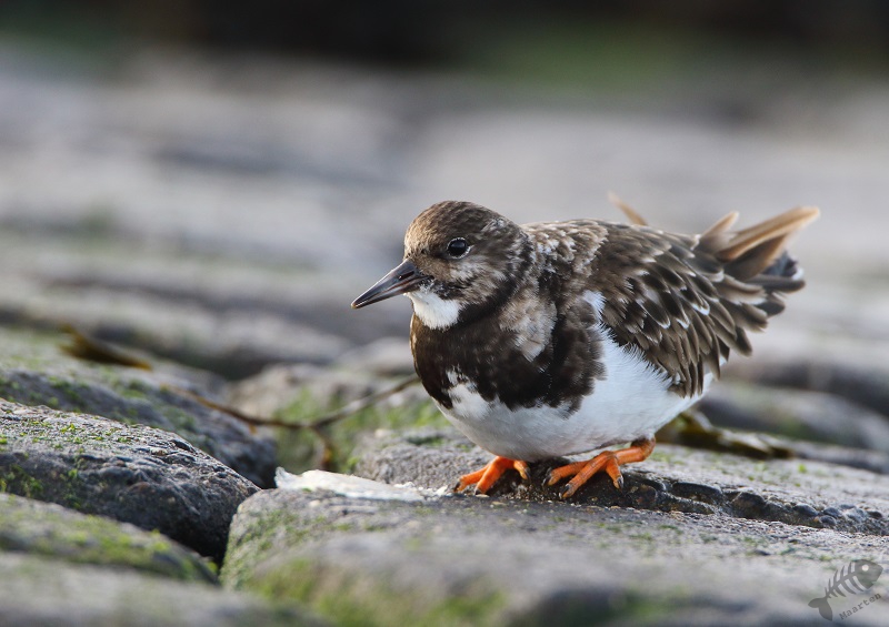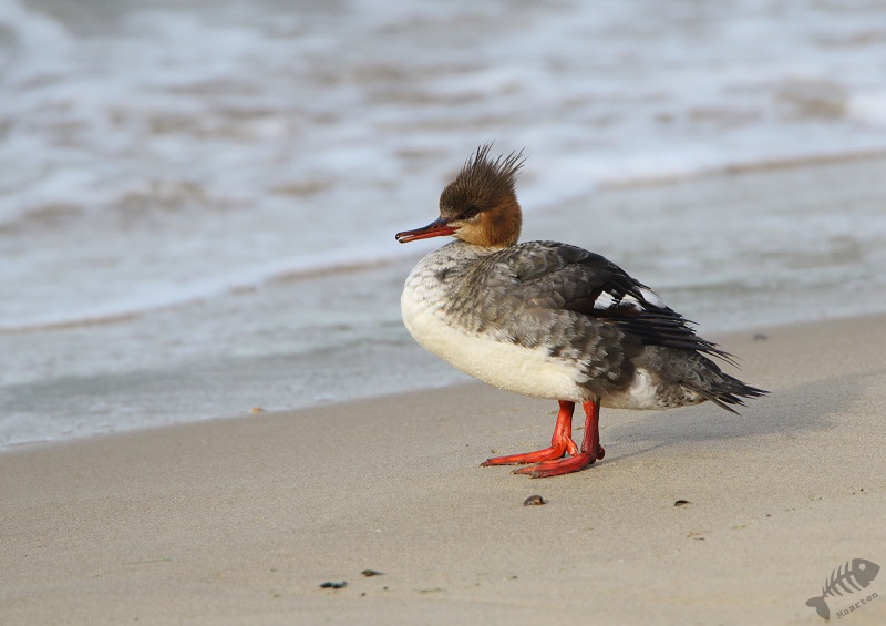 Toen we aankwamen bij het binnenhaventje, had ik al een Steenloper druk bezig gezien op de terwaterplaats. Terwijl ik bezig was de Zwarte Zee-eend zo mooi mogelijk vast te leggen vanaf diezelfde helling, bleek hij er nog steeds te zitten en maakte zijn naam meer dan waar. Toen we tenslotte weer wat verder wilden rijden, bleek één van de Zaagbekken die ik ook had zien rondzwemmen, aan land te zijn gegaan om een beetje te poetsen. Een hele mooie gelegenheid om dit mooie vrouwtje, zeker na de poetsbeurt, eens op een andere manier vast te leggen.