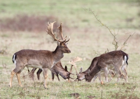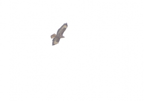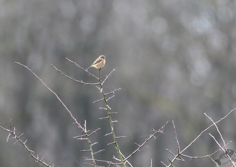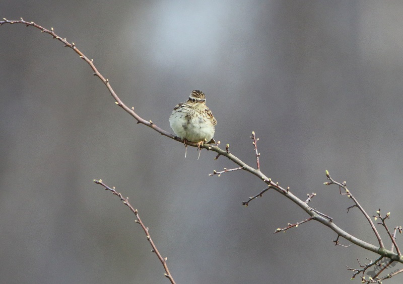 Er liepen Galloways en Konikpaarden en in de verte vond ik een groep Damherten. Aan vogels was er niet zo veel te vinden, een Roodborsttapuit wijfje in de verte en een Buizerd heel hoog, dus ben ik de heide afgelopen en een stukje het bos ingegaan. Hier hoorde ik van alles, maar met name Putters. Het leken er wel honderden, maar ik kreeg ze nooit in beeld. Wel een fraaie Boomklever, waarna ik maar teruggelopen ben om te proberen of de Boomleeuwerik dichterbij wilde komen. Dit gebeurde helaas niet, al leek hij regelmatig in de buurt te landen maar vond ik hem daarna nooit terug.