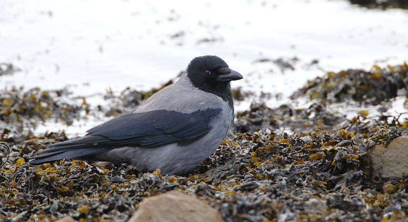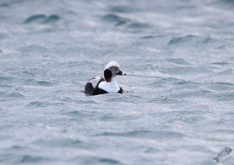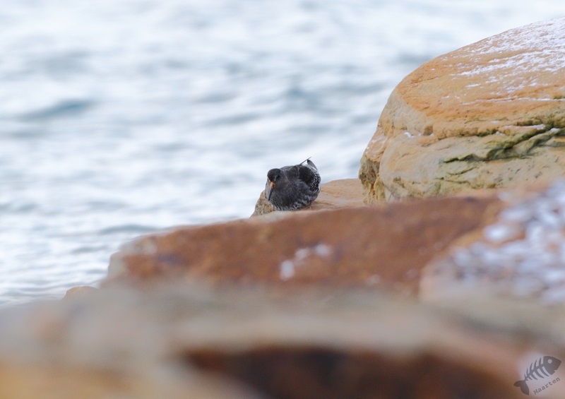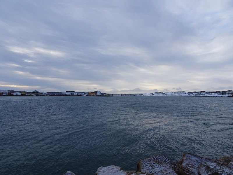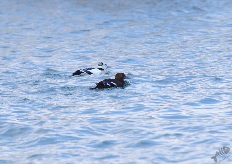 Vadsø is de eerste plaats op mijn route naar Vardø. Het is een redelijke grote plaats met een behoorlijke haven. In Birding Varanger was te zien dat vanaf een pier (met een schuilhut ontworpen en geplaatst door Biotope) en de aanlegplaatsen voor boten, je een mooi uitzicht kon hebben over het water en dat de kans groot was op Eiders, IJseenden (een soort waar ik van te voren wel aan gedacht had, maar, zeer onterecht, niet hoog op het lijstje stond), Stellers Eiders, met enig geluk Koningseiders en nog vele andere prachtige soorten. Bij aankomst in de haven zag ik in het gedeelte waar ik de auto bij parkeerde meteen een koppeltje Stellers Eiders! Wat een begin. Helaas zaten ze net iets te ver weg en zwommen ze van me vandaan, dus besloot ik de pier met de schuilhut op te gaan en te kijken wat ik van daaraf allemaal zou kunnen zien. Een hele leuke soort aan het begin van de pier was een Bonte Kraai. Deze had ik eerder gezien toen ik voor het eerst in Noorwegen was in Tromsø¸ en daarna niet meer. Omdat ze afwijken van onze Kraaien, vind ik het leuk ze af en toe te zien. Halverwege de pier zat een Paarse Strandloper. Over deze soort had ik al gelezen dat het de enige Steltloper was die het hele jaar op het schiereiland bleef: bikkels dus! Vanaf de pier op het water zag ik de eerste Eiders. Deze soort ken ik natuurlijk uit Nederland, van de Waddeneilanden, maar hier komen ze dus ook voor en oh: wat zijn ze mooi! De keer dat ik een koppeltje zag op het Isle of May, had ik het al wel in de gaten, maar hier onder deze omstandigheden leken ze nóg mooier. Ik ben doorgelopen naar de schuilhut en heb er een tijdje in gezeten en foto’s gemaakt. Het is niet zozeer een schuilhut die voorkomt dat de vogels je zien, maar ééntje om te schuilen tegen de elementen, wat geen overbodige luxe bleek. Bij vertrek gaf de thermometer van de auto aan dat het -11° was. Bij de haven bleek het ook flink te waaien wat de gevoelstemperatuur (om maar in populistische termen te spreken) nog een paar graden liet zakken. Nou wist ik waar ik heenging, dus ik had passende kleding meegenomen, maar ik was toch blij dat ik kon schuilen voor de wind.