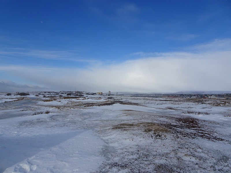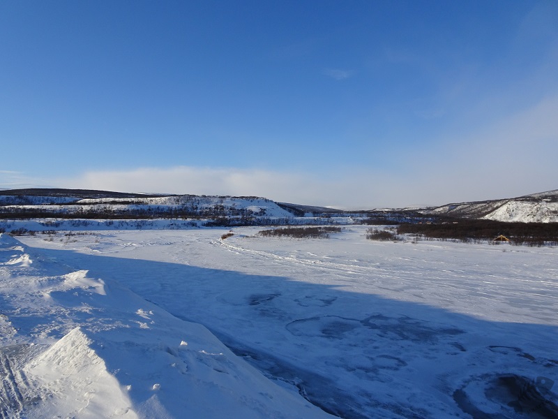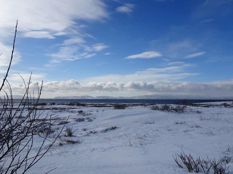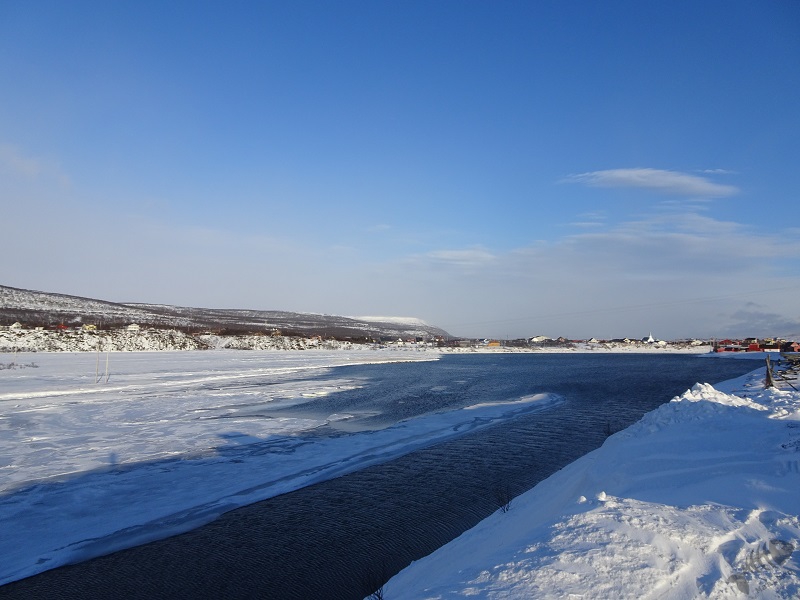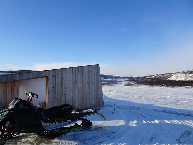 Naarmate ik verder naar het westen kwam, werd het weer steeds beter, totdat er weer blauw aan de hemel kwam en de zon weer een continue factor werd (hij scheen af en toe ook wel door de sneeuwstorm heen, wat eigenlijk het zicht nog minder maakte…). Uiteindelijk kwam ik vrij makkelijk weer in Vestre Jakobselv en omdat het zo’n prachtig weer was, ben ik naar de oevers van de rivier de Vestre Jakobselv gereden, waar ook een schuilhut van Biotope te vinden is, en heb daar de omgeving bekeken en gelijk kunnen zien waar ik de volgende dag om 7 uur moest zijn om op excursie te gaan. Gelukkig dichtbij, dus ik hoefde niet zo heel vroeg op…