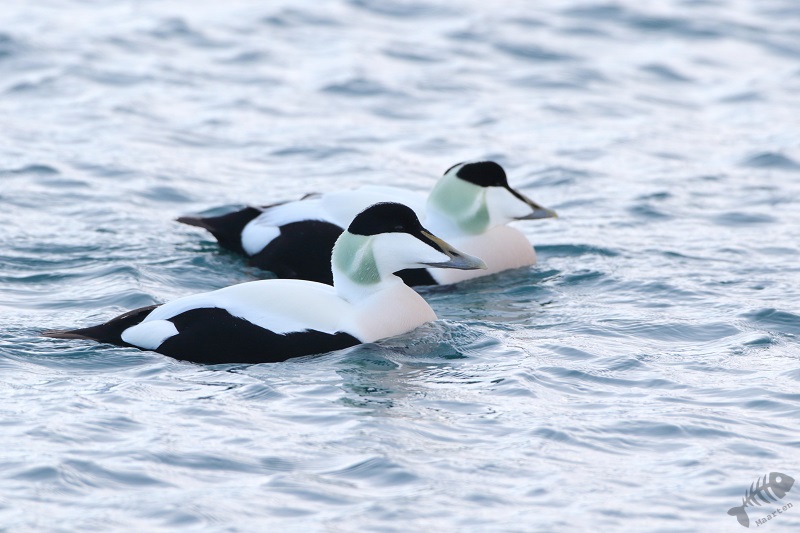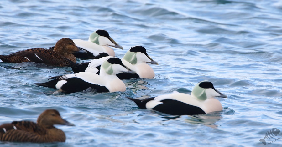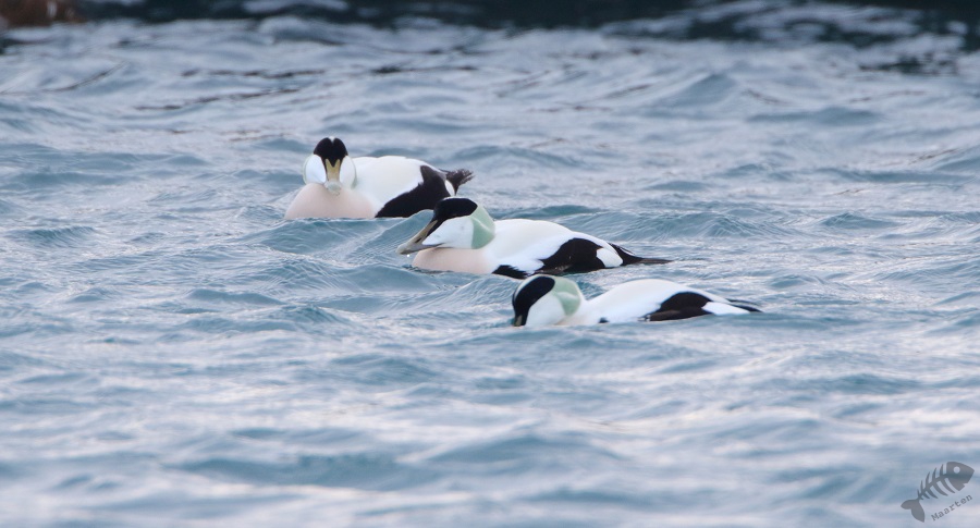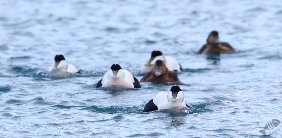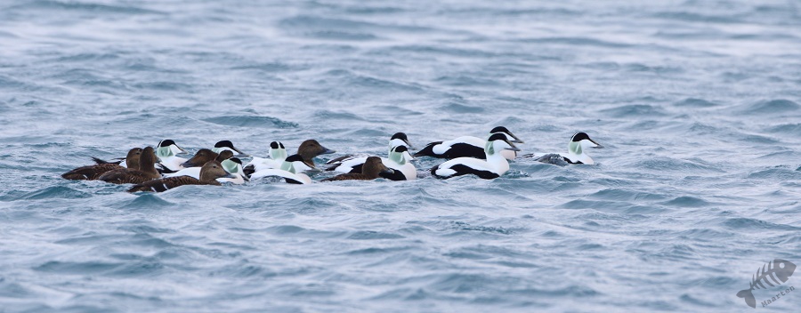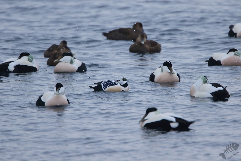 Toen ik bij Kiberg kwam, was het even wat rustiger en ben ik naar het haventje gereden. Ook hier zouden de verschillende Eiders te vinden moeten zijn, dus leek het me de moeite waard. Gelukkig klopte het weer helemaal en trof ik een groep Eiders en Stellers Eiders. Helaas waren hier weer geen Koningseiders bij, maar de wel aanwezige dieren gaven weer een prachtig beeld. Maar na een klein kwartier werd het zicht weer minder en zag ik de bui al weer hangen: er had zich een nieuwe sneeuwstorm aangekondigd. Ik ben weer snel naar de auto gegaan en wilde gaan rijden, maar na zo’n 200 meter zag ik te weinig en heb ik de auto stilgezet. Ik zag werkelijk niets meer en moest wachten tot het weer iets beter werd. Ook nu duurde het gelukkig niet heel lang voordat er weer iets zicht was en kon ik weer verder, de grote weg op.
