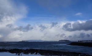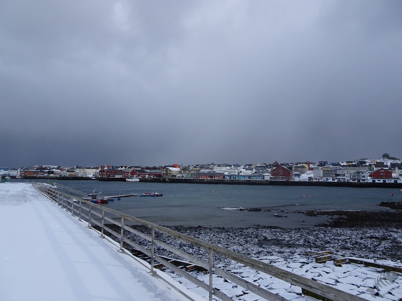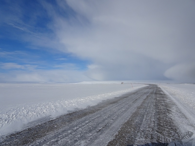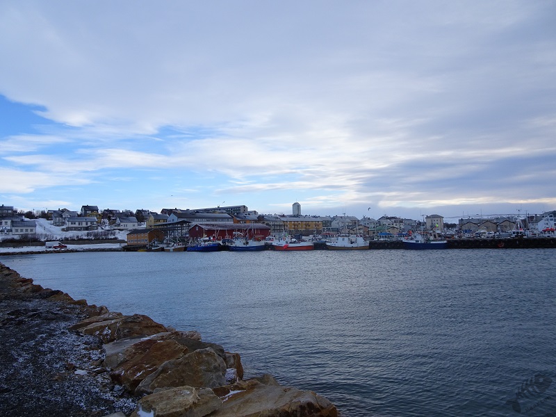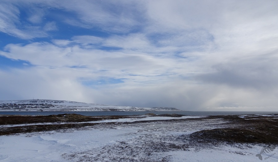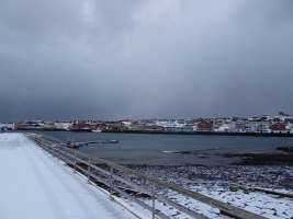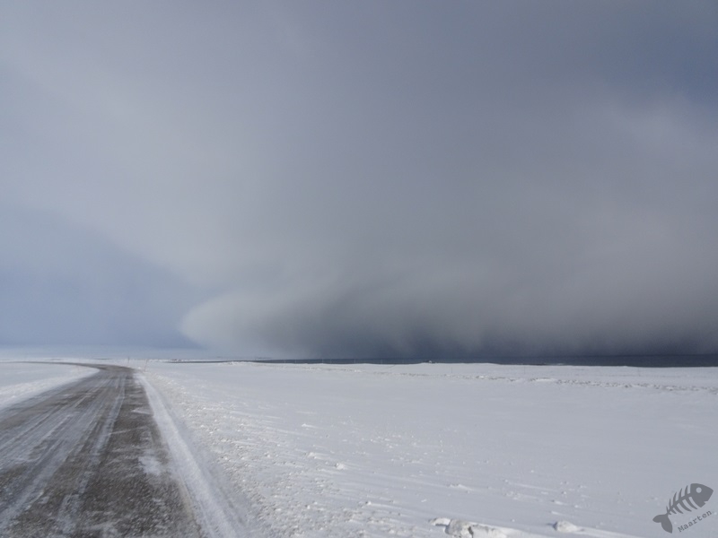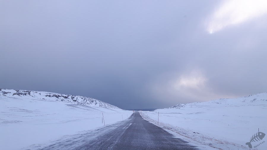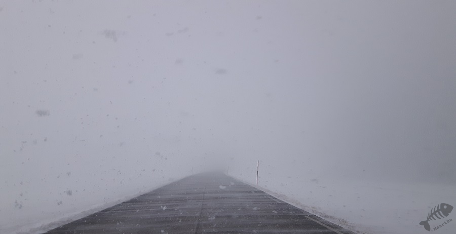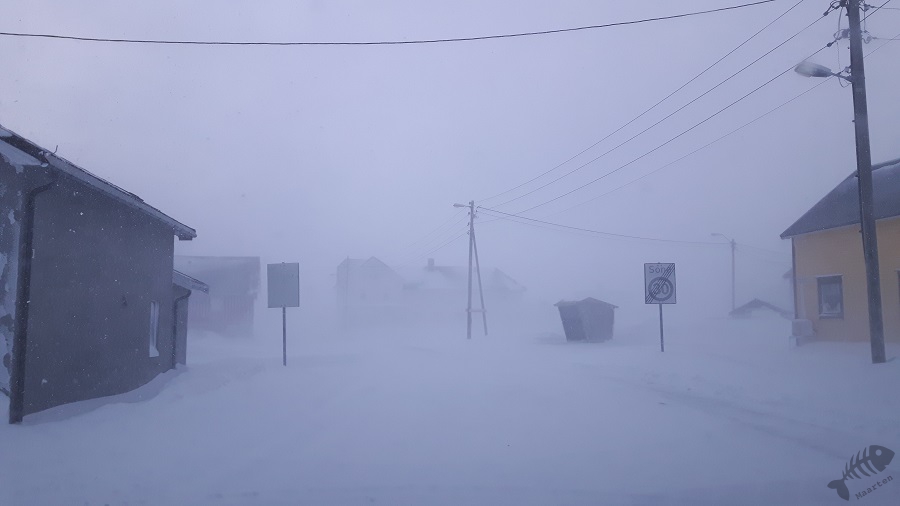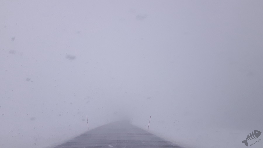 Vanuit de auto zag ik heel in de verte in het oosten de meest dreigende en gigantische wolkenpartijen voorbij drijven. Ze leken ver weg, dus ik zag er nog geen probleem in. Totdat ik steeds verder kwam en op een bepaald moment midden in een sneeuwbui terecht kwam. Door de enorme wind blies de sneeuw vanaf de hoogtevlakte over de weg, waardoor deze bijna niet meer te onderscheiden was van de compleet witte omgeving. Door de hevige sneeuwval was de lucht ook wit wat me het gevoel gaf door een pak melk te moeten rijden. Gelukkig stonden er aan de rand van de weg om de zoveel meter een soort skistokken die de kant van de weg markeerden waarop ik me nog een klein beetje kon oriënteren. Ik kon niet anders dan stapvoets rijden en ik kreeg al visioenen dat mijn witte auto niet al te opvallend zou zijn voor een overenthousiaste sneeuwschuiver… De sneeuwbuien kwamen inderdaad in buien en trokken weer voorbij, zodat ik af en toe weer opgelucht kon ademen en door kon rijden, maar een groot deel van de weg heb ik behoorlijk in de rats gezeten en ik was enorm blij toen ik de tunnel in kon rijden die Vardø met het vasteland verbindt. Aan het einde van de tunnel sneeuwde het niet en ik was er gekomen: Vardø!