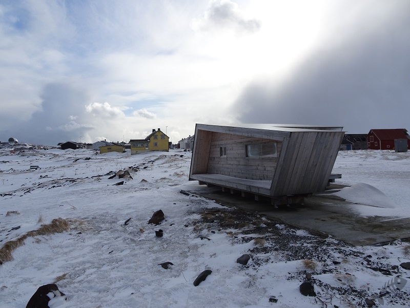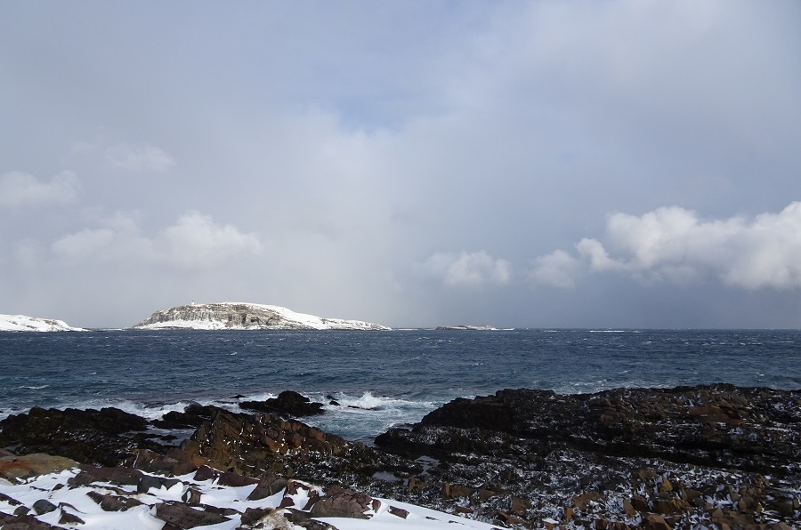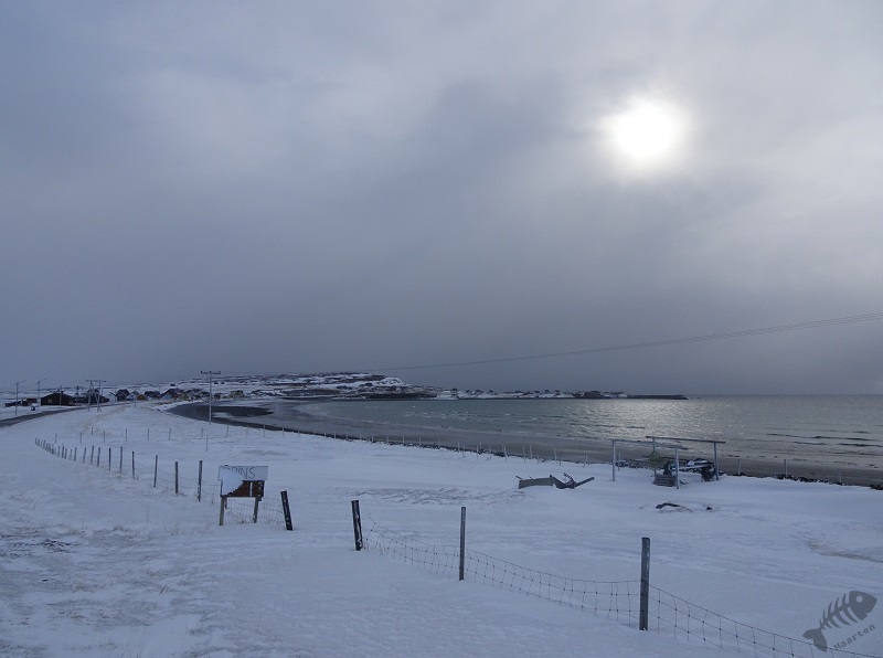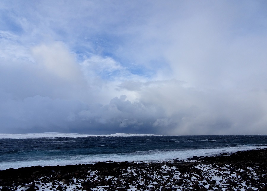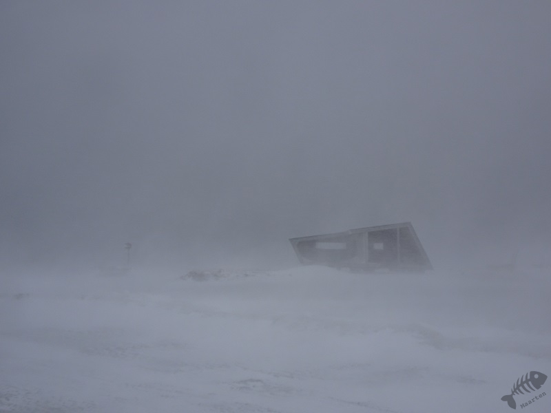 Tijdens een volgende sneeuwbui ben ik naar een schuilhut van Biotope gereden. Deze ligt op de uiterste noordoost punt van het eiland, Hasselnes, met prachtig zicht op Reinøya, Hornøya en de Barentszzee. Ik dacht even te wachten in de auto tot de bui voorbij was, maar het werd alleen maar heviger, zodat de schuilhut van een paar meter afstand nauwelijks meer zichtbaar was. Maar ook deze bui dreef voorbij (wat met de enorme wind ook wel moest gebeuren…) en na een kleine 10 minuten had ik weer prachtig uitzicht op beide eilanden. Vanaf het noordwesten zag ik een volgende bui alweer aankomen vanaf de Barentszzee en over Skagen (het westelijke deel van Vardø) en ik ben weer in de auto gestapt en besloot maar weer richting huis te gaan. Als die sneeuwbuien zo bleven komen, wilde ik liever niet in het donker terugrijden…