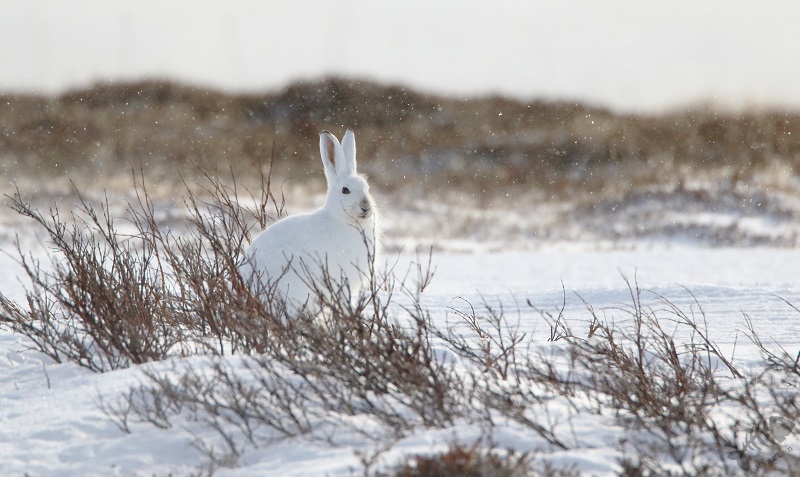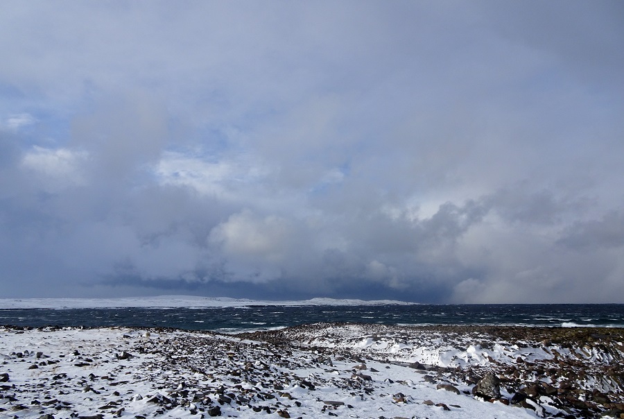 Dat bleek dus wel een verstandig besluit, want de sneeuwstormen bleven komen. Deze stormen woeden met name over het oostelijk deel van het schiereiland, omdat hier een echt arctische klimaat heerst: er loopt een denkbeeldige lijn diagonaal over het schiereiland, van west naar oost. Ten zuiden van deze lijn is er sprake van een taiga, iets gematigd, klimaat waarin nog bomen groeien. Ten noorden van deze lijn heerst het arctische/toendra klimaat en groeien er alleen nog struiken en rendiermos (en natuurlijk van alles laags waar ik geen weet of naam van heb…Toendra zou vertaald uit het Kildin Sámi, iets als “boomloze berg” betekenen.). Wanneer de wind uit het noordwesten komt, komt hij zo’n beetje rechtstreeks van Groenland en/of de Noordpool over de Barentszzee, waar niets hem tegen houdt, en landt in volle hevigheid op Varanger. Nou en deze omstandigheden heb ik een aantal keer mogen ervaren! In het boek van Biotope had Tormod Amundsen al geschreven dat een verblijf op Varanger zonder sneeuwstorm niet volledig was, dus ik kan concluderen dat mijn bezoek dat dus zeker wél was!