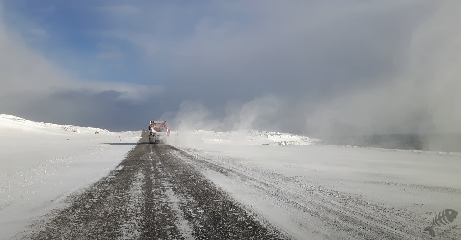 Na Vadsøya ben ik weer in de auto gestapt en ben richting Vardø gereden. Dit zou een klein uur rijden zijn, dus ik ging er even lekker voor zitten. Onderweg heb ik eerst nog de afslag naar Ekkerøy genomen, waar helaas niet heel veel bijzonders te zien was. Wel weer enkele Sneeuwgorzen, maar deze wilden niet poseren. Naast Ekkerøy ligt een hoge klif waar veel Drieteenmeeuwen op zouden broeden. Gezien de sneeuw kon ik niet die kant op en ben ik weer verder gereden. Weer net op de “grote” weg, kwam ik achter een sneeuwschuifvrachtwagen. Ik dacht nog: “wat houden ze die wegen hier toch schoon, nu vegen is toch helemaal niet nodig…”, maar niet veel later dacht ik daar wel anders over…