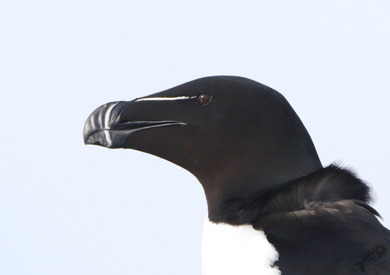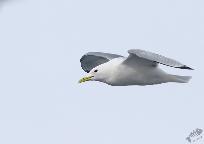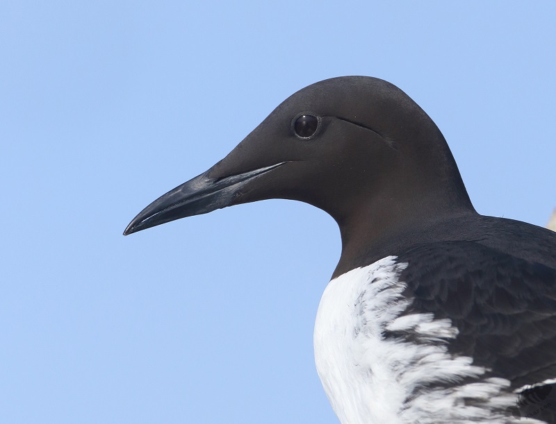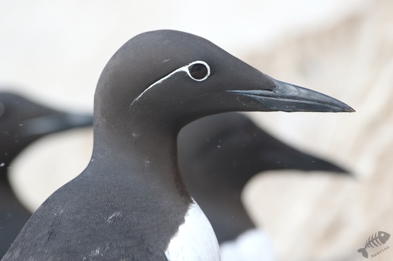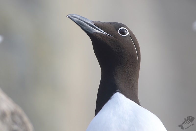 Door de enorm harde noordoosten wind konden de grote aantallen vogels, die vanuit het zuiden kwamen, niet heel hard vliegen voordat ze op de kliffen landden. Hierdoor was ik in de gelegenheid met name Zeekoeten in vlucht vast te leggen en kon daarvoor regelmatig ook de grote lens gebruiken, zodat ik allerlei verschillende beelden kon maken. Vertrekkende Papegaaiduikers lukten ook aardig omdat ze voor de start alleen hun vleugels maar uitsloegen en zo iets boven de rotsen kwamen te zweven. Toen ik eenmaal weer in Nederland de foto’s ging bewerken en intensiever bekijken voor deze site, bleek ik wel een Kortbekzeekoet vastgelegd te hebben! In een opname waarop ik gefocust dacht te hebben op gewone Zeekoeten, vloog onderin de hoek een Zeekoet met een duidelijk witte streep van de snavel tot de wang. Dit is eigenlijk hét belangrijkste kenmerk van deze Koet en daarmee kan ik hem bijschrijven op mijn alsmaar langer wordende lijst!