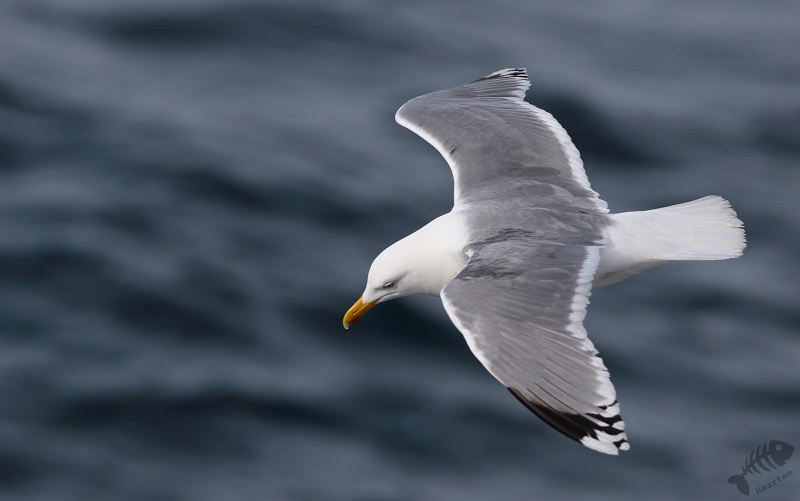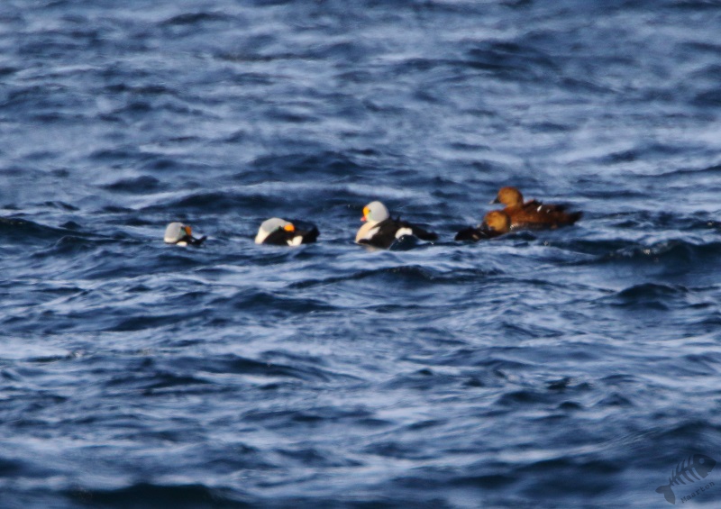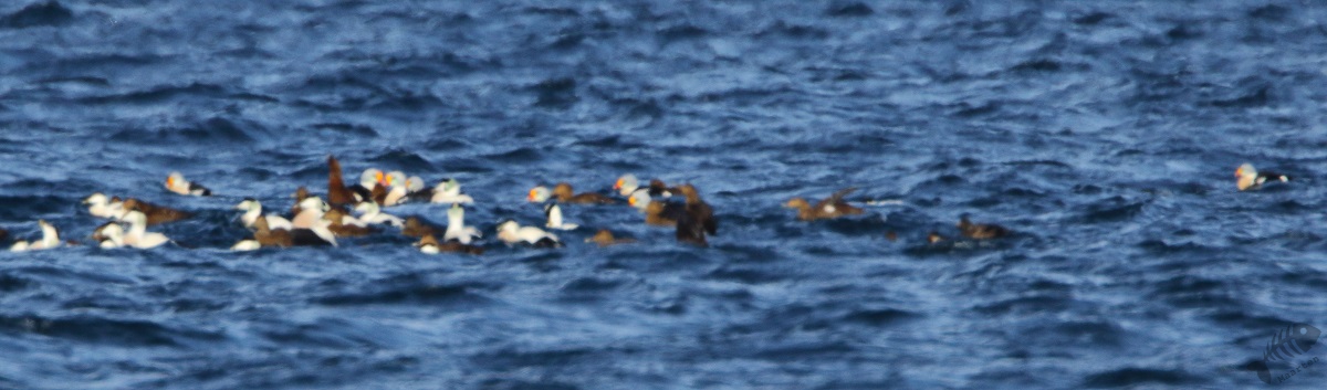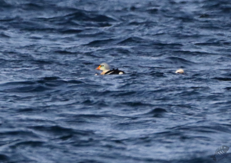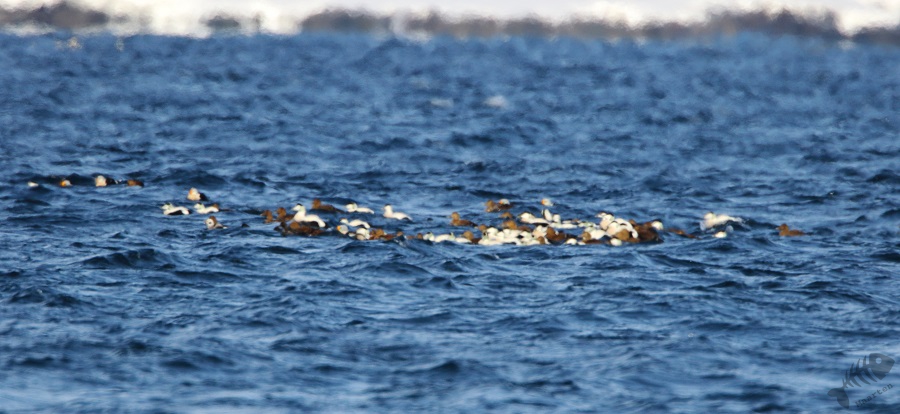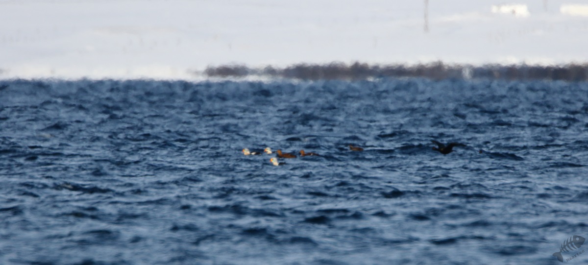 Eenmaal weer op Vardø, heb ik een snel rondje haven gedaan. Misschien waren de Koningseiders wel de haven ingezwommen, wat ze kennelijk wel eens doen… Helaas. Vandaag was dat niet het geval, maar wel zwom er een “raft” Eiders in de monding van de haven. Het blijkt dat Eiders, willekeurig welke, tijdens de winter enorme groepen vormen op zee om zich te beschermen tegen de elementen. In het boek van Biotope wordt beschreven dat deze groepen uit honderden of zelfs duizenden exemplaren kunnen bestaan en zwemmen zo dicht bij elkaar dat de verschillende exemplaren niet meer te onderscheiden zijn en je ze dus eigenlijk niet kunt tellen. In het Engels noemt men dit een “raft” vertaald “vlot” wat een zeer toepasselijke naam lijkt. Zo veel waren er hier niet. Dit was een minivlotje van 19 dieren en waterdicht leek het vlot niet… Ik heb nog even verder gezocht naar andere soorten, waarbij ik eindelijk de kraan vond met het symbool van Biotope erop, maar vond geen vogels meer en vanwege de volgende bui ben ik weer naar de auto gegaan. Toch baalde ik best een beetje van het feit dat ik de Koningseiders niet beter in beeld had gekregen. Natuurlijk vond ik het gaaf ze gezien te hebben en min of meer zelf gevonden te hebben, maar toch: het was voorlopig mijn laatste kans en ik had het gevoel deze helemaal te moeten benutten. Ik ben toen richting het kantoor van Biotope gereden welke aan het Østervågen ligt en waarin ook verschillende Eiders gezien worden. Ik kwam uiteindelijk op de meest zuidelijke punt en heb vandaar de zee, het Bussesundet, afgezocht en na enige tijd vond ik ze weer! Er zwommen weer enkele groepen Eiders, maar één ervan bestond uit Koningseiders. De fotografie-omstandigheden leken nu iets gunstiger, al werd het licht al behoorlijk minder, maar daardoor was de lucht minder “blurry” en kreeg ik betere plaatjes dan deze ochtend. Ik kon zelfs nog een voorbijvliegend exemplaar vastleggen en toen was het mooi geweest.
