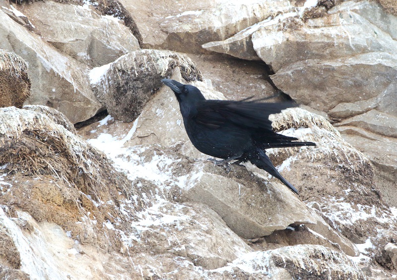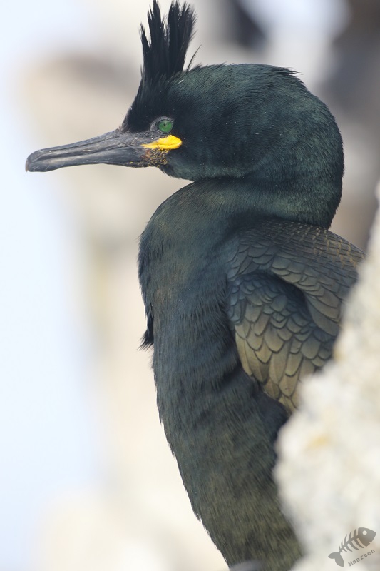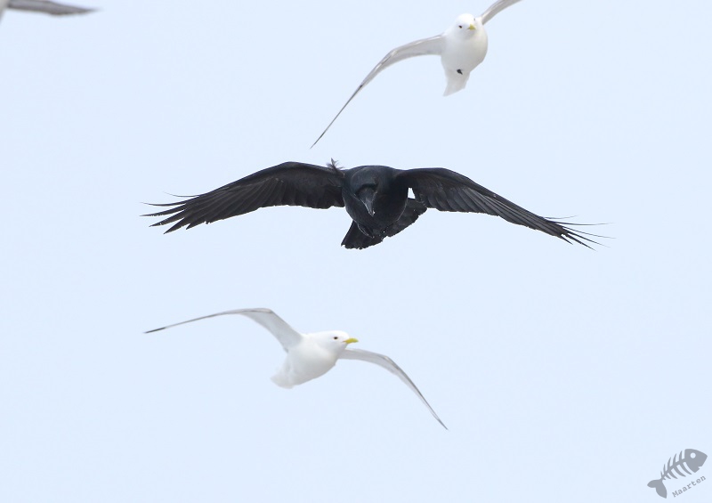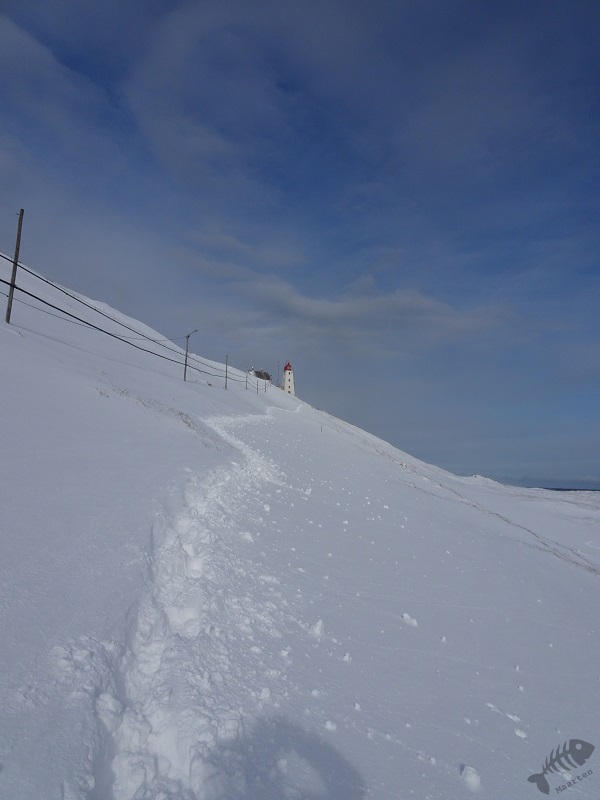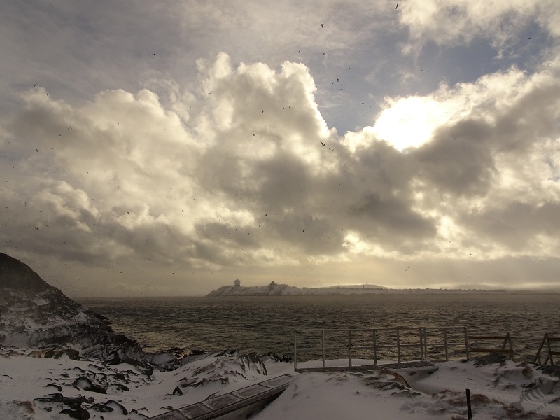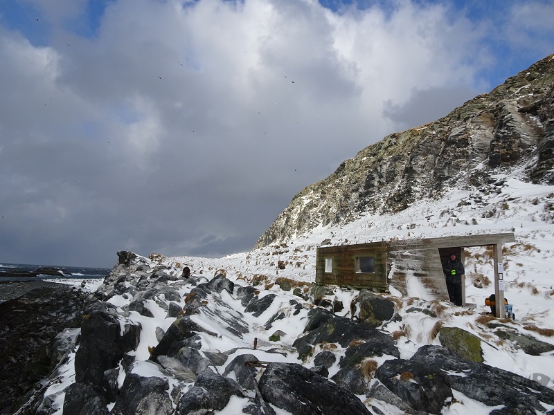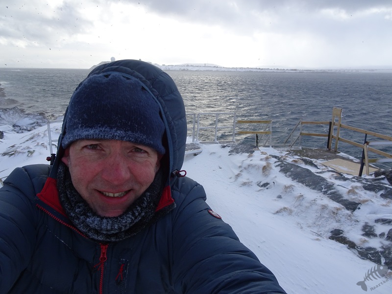 Onderweg, de tocht duurde een kleine 10 minuten, vloog er een groep Koningseiders voorbij maar moest ik deze jammerlijk voorbij laten gaan. Dichter bij het eiland zwommen enorme hoeveelheden Zeekoeten op het water welke in een enorme vlucht opstegen toen de boot dichterbij kwam. Zelden heb ik zulke aantallen vogels bij elkaar gezien! De landing, bij een schuilhut van Biotope, was nog tricky door de hoge golven, maar we kwamen allemaal droog aan land en het serieuze vogelen kon beginnen. Zoals je kunt verwachten op een vogeleiland, was er een kakofonie aan geluid en een redelijk doordringende geur… Ook hier zaten enorme hoeveelheden Zeekoeten en ook was mijn favoriete Meeuw aanwezig: de Drieteenmeeuw. Een clubje van 4 Raven vloog rond en veroorzaakte de nodige consternatie opzoek naar eieren en ander voedsel. Ook zaten er verschillende Kuifaalscholvers wat ik altijd fascinerende dieren vind. Ze zijn wat kleiner dan hun grote neven, de Aalscholver, maar komen juist op deze eilanden en kusten voor onder veel hardere omstandigheden. Na de eerste tientallen foto’s gemaakt te hebben, zocht ik verder naar de Papegaaiduiker maar deze kon ik niet vinden. Een Spiegelglad paadje (ik schrijf het bewust met een hoofdletter omdat tientallen mensen de sneeuw vastgelopen hadden en het in een steile ijsbaan hadden veranderd) leidde verder omhoog en naar de achterkant van het eiland. Er gingen niet veel mensen heen, maar ik dacht dat de Papegaaiduikers daar misschien te vinden zouden zijn. Toen ik een hoek omkwam, bleek er nauwelijks meer sprake van een pad te zijn, alleen een voetspoor in de sneeuw van 1 persoon die me voor was gegaan langs een behoorlijk steile helling, en ik besloot dit toch te volgen. Het liep naar de vuurtoren bovenop het eiland en ik kreeg vanaf deze helling mooie uitzichten richting het oosten op onder andere Avløysa en Store Avløysa waarop ook Drieteenmeeuwen, Zeekoeten en Kuifaalscholvers te zien waren maar nog steeds geen Papegaaiduikers…