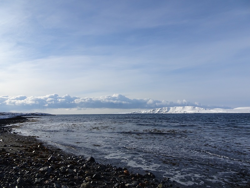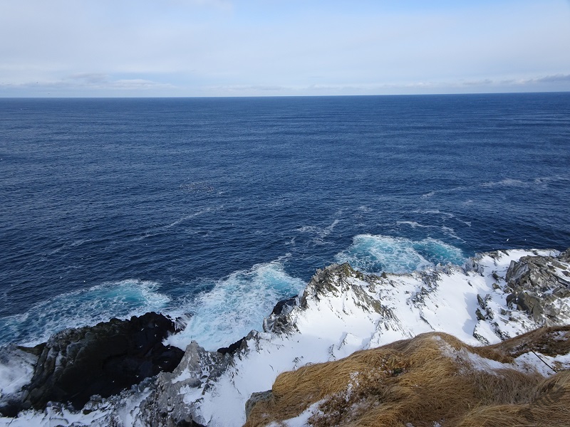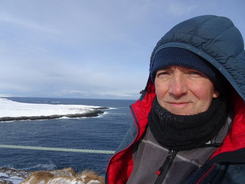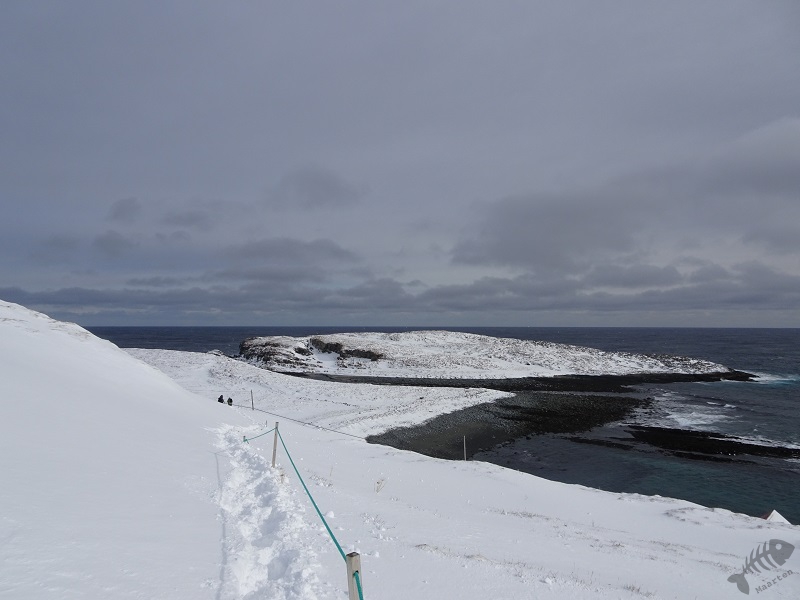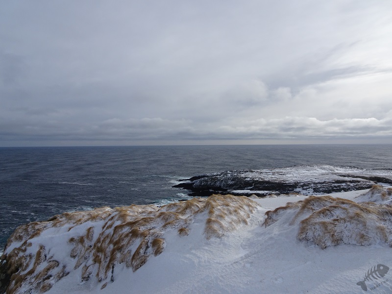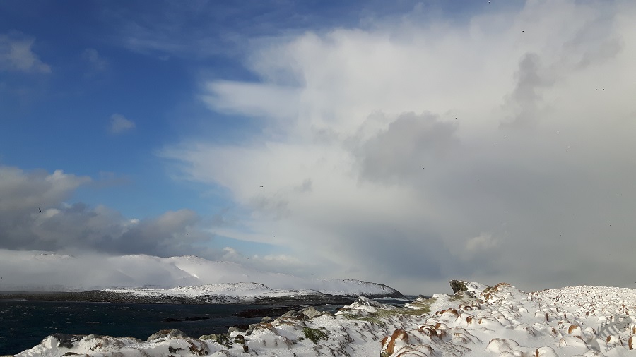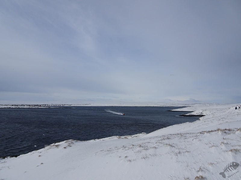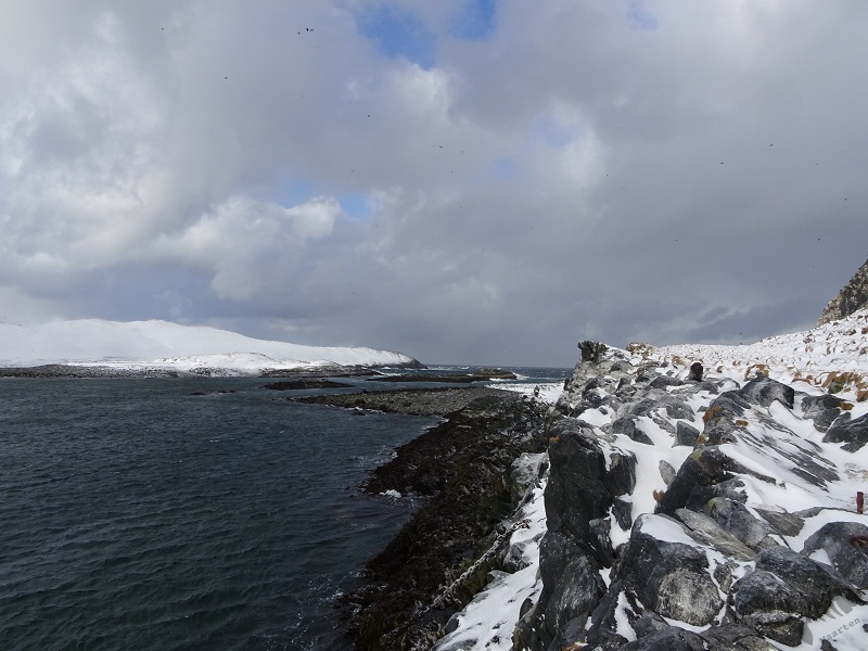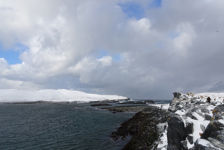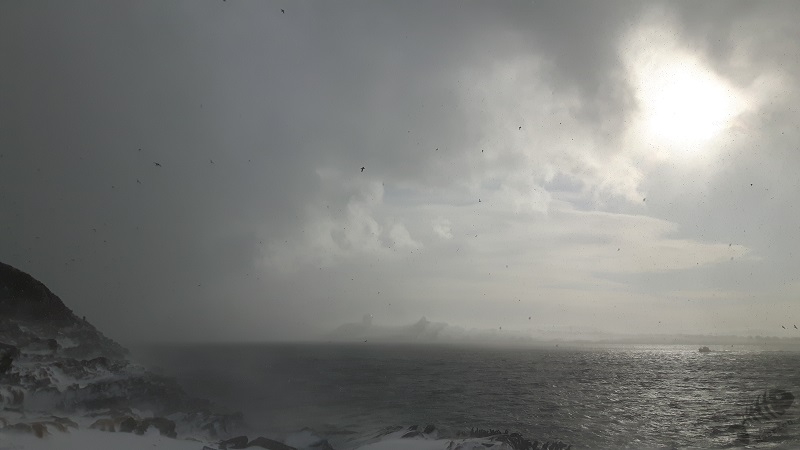 Ik had aangegeven dat ik om 15 uur weer terug wilde met de boot. Toen de boot van 14 uur aanlegde om de mensen van dat uur op te pikken had ik een klein beetje spijt… Het leek of het nóg harder was gaan waaien en deze wind had weer eens een sneeuwstorm meegebracht. Maar nu zat ik zonder enige beschutting op een eiland en ik vroeg me af of dat de meest gunstige situatie was… Het lukte door de enorme wind niet om af te dalen naar de schuilhut van Biotope. Het pad was veel te glad, ik was zwaar beladen en de wind deed me m’n evenwicht verliezen, dus ben ik maar gaan zitten met de rug naar de wind gekeerd en heb de bui afgewacht. Het duurde ongeveer 20 minuten en ik ben toen op mijn knieën het pad een stuk afgegaan. Ik was dan ook blij dat ik eindelijk bij de schuilhut kwam en dat de boot een klein half uur later er ook weer was.
