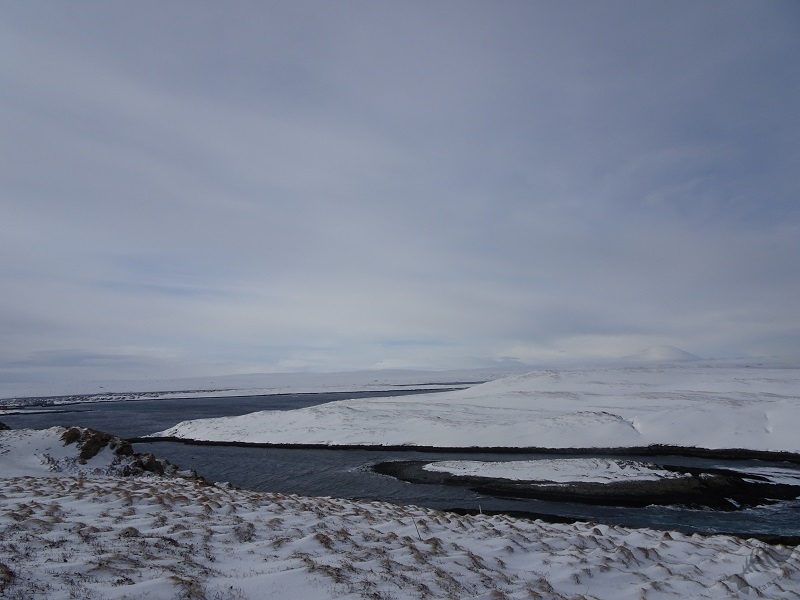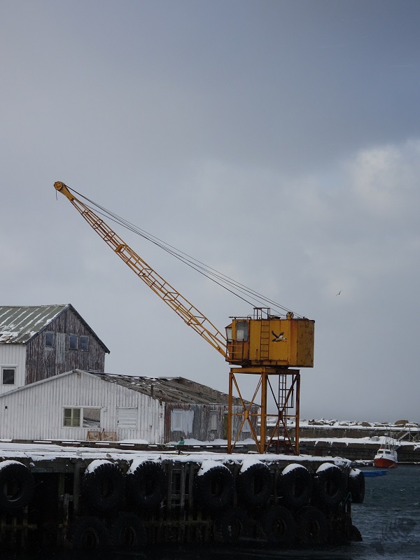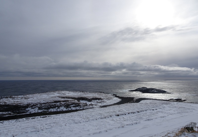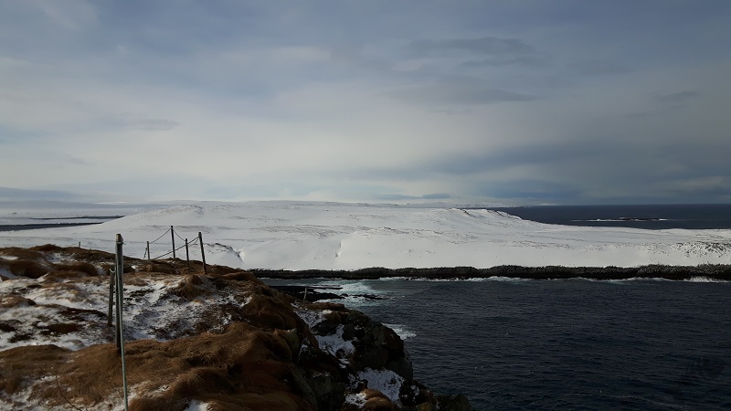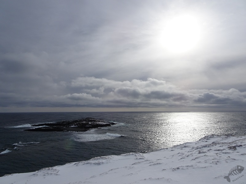 Toen ik op het eiland aankwam, ben ik direct de andere kant opgegaan als waar ik de keer ervoor geweest was. Tormod had aangegeven dat vanaf de schuilhut van Biotope op Steilnes de kans groot was Koningseiders te kunnen zien. Ondanks dat ik in de goede hoek, de zuidwest kant, van het eiland zat, heb ik de schuilhut nooit gevonden. Natuurlijk lag het hele eiland onder een dik pak sneeuw, waardoor ik wegen en paden niet makkelijk kon vinden. Ik ben toen maar gestopt bij een bijzonder uitziend bouwwerk: een soort grote zwarte vierkante glazen doos en ernaast een lange gang op palen. Toen ik later weer terug was in het hotel, vertelde de eigenaresse dat het een monument was ter herdenking van de heksenjacht die zo’n 350 jaar geleden zich hier had afgespeeld en in Vardø extreem werd uitgeoefend.