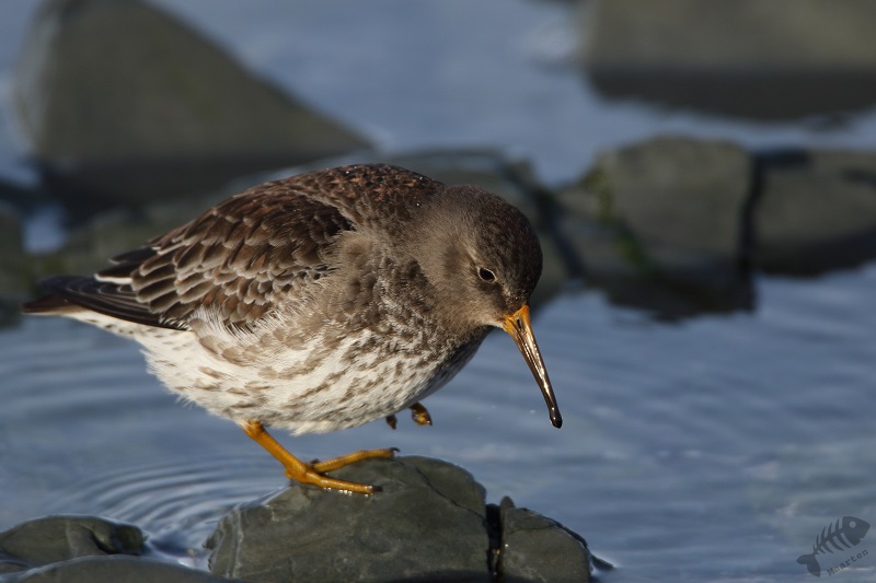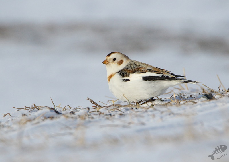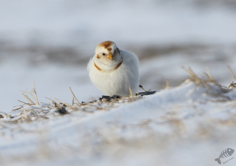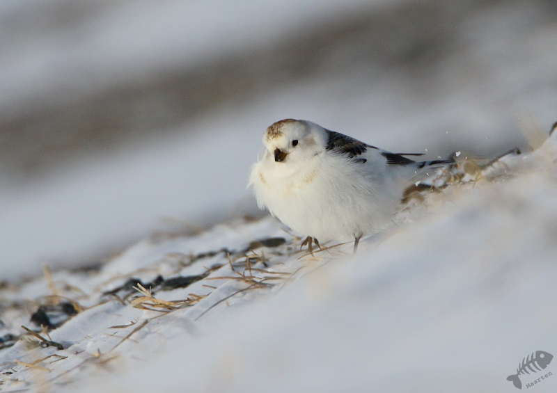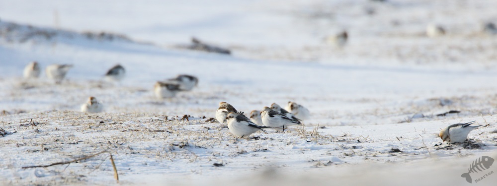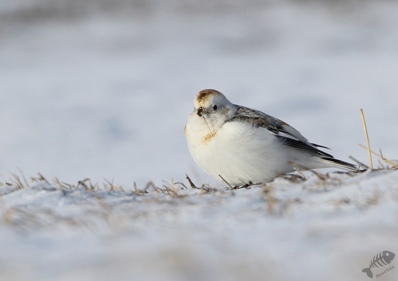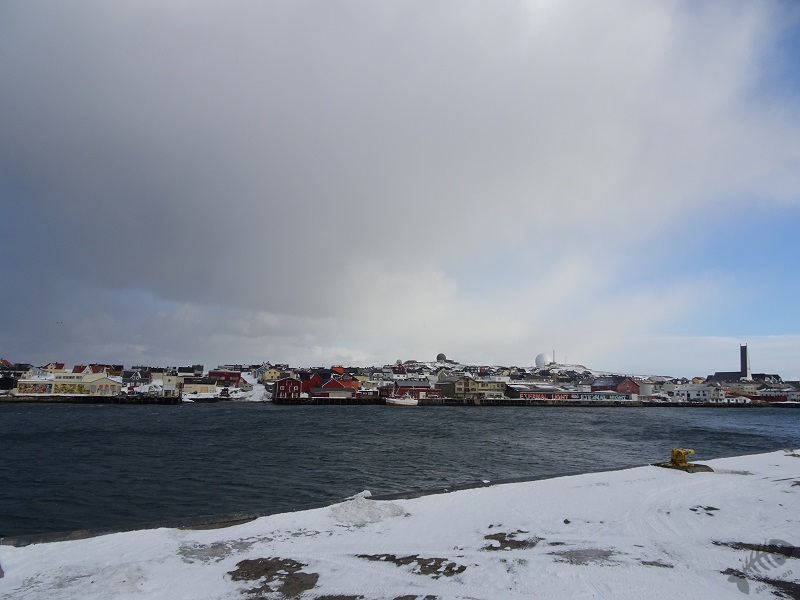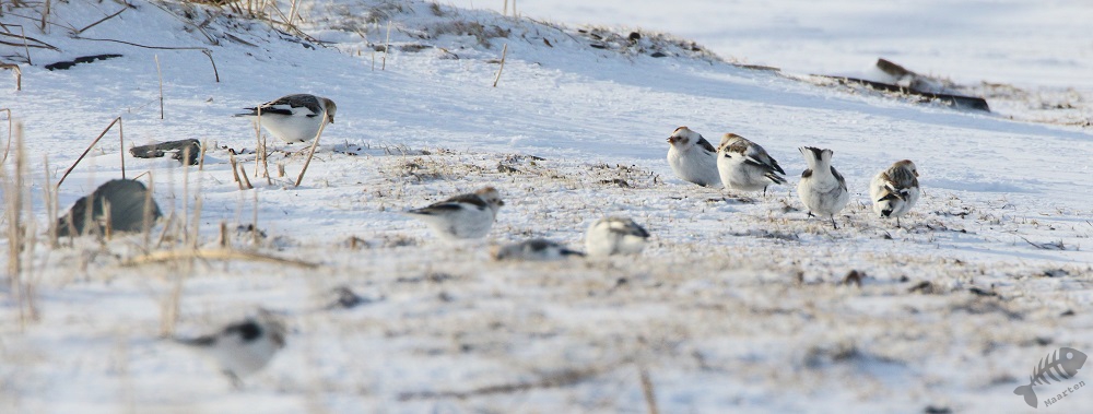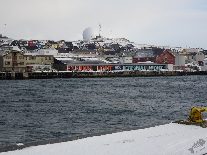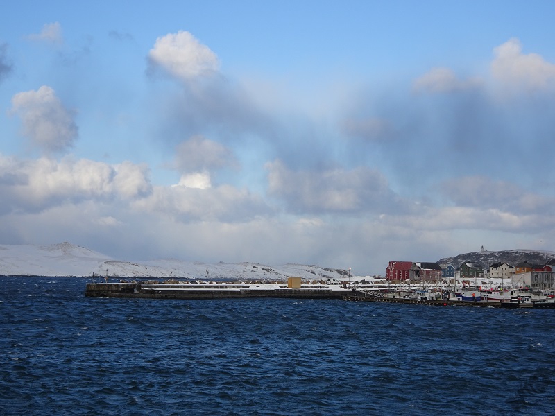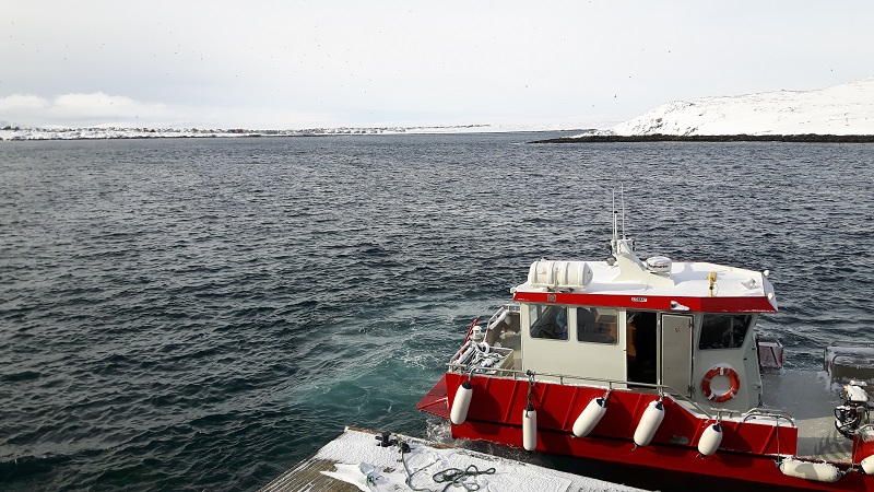 Om goed uitzicht over het water te krijgen, ben ik afgedaald naar het zwarte kiezelstrand en heb deze een stuk richting het noorden afgelopen. Vanaf dit strand had ik een goed zicht over de Bussesundet, waar Tormod van aangegeven had dat de Koningseiders zich zouden kunnen bevinden. En al vrij snel vond ik inderdaad een groepje Koningseiders! Helaas op grote afstand, maar ik had ze gevonden. Snel ben ik foto’s gaan maken, maar de deining en de grote afstand maakte dit niet makkelijk. Ook bleek bij thuiskomst dat de foto’s wat blurry waren, wat, denk ik, te maken had met de zon die volop scheen en daarmee de lucht en het water verwarmde waardoor de lucht onscherp werd. De grote afstand versterkte dit effect nog meer. Ondanks dat was ik blij ze gevonden te hebben en na nog wat foto’s van een Paarse Strandloper, ben ik weer terug naar de auto gegaan om opzoek te gaan naar het kantoor van Biotope. Ik zat goed en wel in de auto toen ik ineens een Sneeuwgorsje zag. Snel de camera in het open raam, op de spiegel van de auto gelegd en kon ik hem fotograferen. Tot mijn grote geluk, bleken er nog verschillende te zitten en hadden ze af en toe de neiging een beetje mijn kant op te komen terwijl ze de grond afzochten naar voedsel. Er zaten al mannetjes bij die een beetje hun voorjaarspluimage droegen, wat ik helemaal leuk vond omdat ze bij ons eigenlijk alleen in hun winterkleuren te zien zijn. Na de nodige foto’s kon ik dan eindelijk gaan. Een oudere Noorse heer wees me de weg (Tormod had het adres naar de hoteleigenaresse ’t en zij weer door naar mij, maar ik kreeg de straat niet gevonden) en even later stond ik in het kantoor van Biotope. Na een kort, gezellig gesprek met de nodige tips (met name dat ik eind Mei/begin Juni zeker nog een keer moet komen…) ben ik snel naar de haven gereden, naar het Vardø Hotel waar je kaartjes voor de boot kon kopen, en ben ik snel naar de aanlegplaats gelopen waar een korte instructievideo getoond werd over de oversteek met de boot en het verblijf op Hornøya. Toen konden we aan boord gaan en vertrokken we onder een stralende zon naar het eiland.