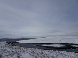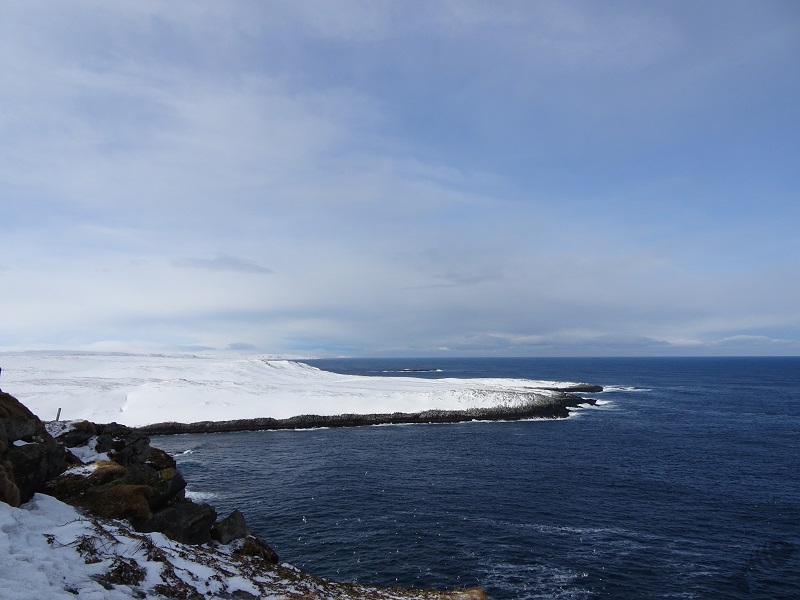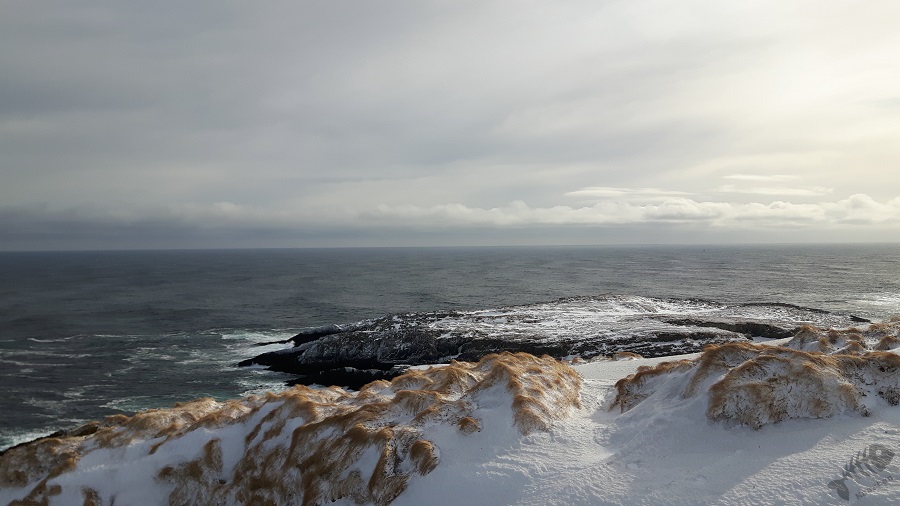 Na een behoorlijk inspannende wandeling, bereikte ik de vuurtoren (de inspanning werd natuurlijk onder andere veroorzaakt door de klim, maar niet in de laatste plaats doordat ik de hele weg mijn best moest doen niet naar beneden te glijden met al m’n spullen en alle gevolgen van dien…). Er zaten geen vogels op de top, maar de inspanningen werden ruimschoots vergoed door de prachtige vergezichten. Wat een weidsheid! Eén van de meest bijzondere dingen vond ik wel dat ik uit stond te kijken over de Barentszzee. Hier ligt de grond (water) voor één van Neerlands roemrijke ontdekkingsreizigersverhalen. Te denken dat Willem Barentsz hier zo’n 400 jaar geleden voorbij voer en strandde op een eiland dat vanaf hier niet eens zo gek ver ligt, en dat hij daarmee de weg heeft vrijgemaakt voor één van Neerlands slechtste films en veroorzaker is van een zeer lastig en raar te spellen naam voor een zee… Maar ik dwaal af.