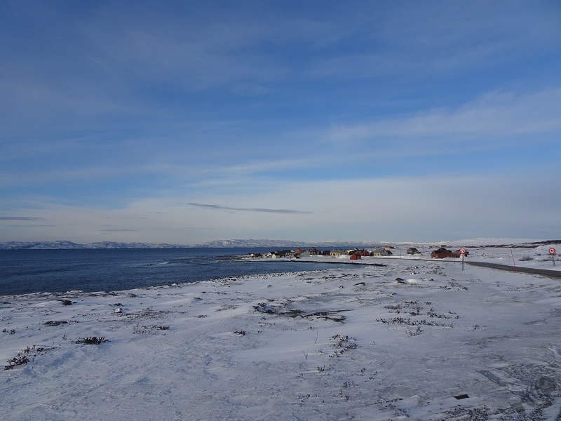 De dag kon nauwelijks mooier beginnen! Ik was weer vroeg wakker en om 7 uur zat ik in de auto om op weg te gaan naar Vardø. Ik zag best een beetje op tegen de rit, gezien mijn vorige ervaring naar het eiland, maar de weersvoorspellingen waren gunstig, dus daar hield ik me maar aan vast. En gelukkig bleek de voorspelling te kloppen. De hele weg werd ik vergezeld door de zon en kon ik eindelijk zien waar ik 2 dagen ervoor nou eigenlijk gereden had. Vooral veel sneeuw, zo het bleek, en veel uitgestrektheid. Na een uur bereikte ik de tunnel en zag ik Vardø in de verte liggen.