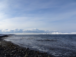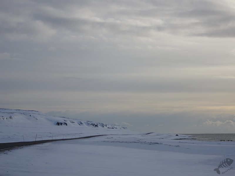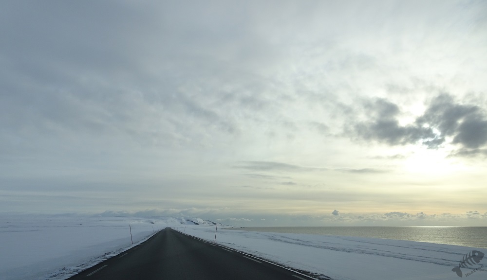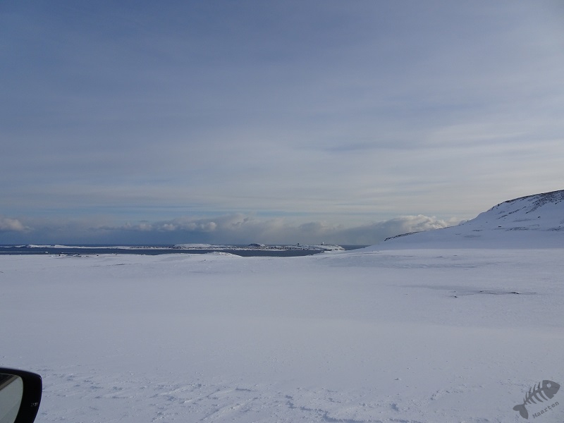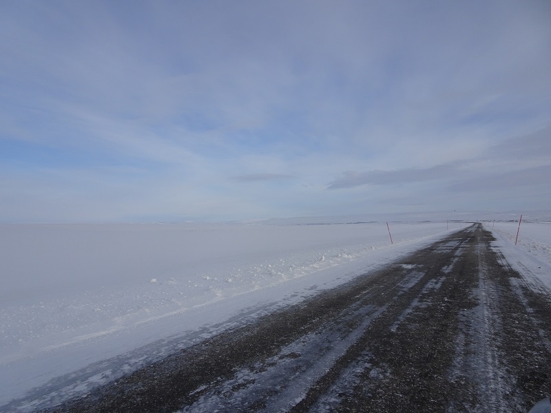 Ik ben de tunnel weer ingereden en het vaste land opgegaan. Ik hoopte op gunstiger omstandigheden dan de eerste keer dat ik deze route reed, maar de voortekenen leken niet zo gunstig. En het kwam ook uit. Weer ontstellend harde wind met enorme sneeuwbuien maakten de rit, op z’n zachtst gezegd, onplezierig. Van tijd tot tijd zag ik helemaal niets en ben ik zelfs zachtjes in een sneeuwmuur gereden. Ik stond muurvast en terwijl ik buiten de auto bezig was mijn veiligheidshesje aan te doen, om maar proberen een beetje zichtbaar te worden, stopten er 2 tegenliggers om me te helpen. Niet helemaal zeker hoe het te doen stonden we de zaak te bekijken en stopte er zo’n enorme sneeuwschuivervrachtwagen. De man die me als eerste wilde helpen, sprak even met de chauffeur en vertelde dat deze me eruit zou trekken. Daarna moest ik hem maar volgen om iets op weg te komen. Hij zei wel dat hij een eindje verderop moest draaien, maar dat nog iets verder de omstandigheden beter zouden worden. Zo gezegd, zo gedaan. Het eerste stuk stapvoets rijdend ben ik weer verder gegaan en na enige tijd kreeg ik inderdaad weer zicht en nog wat verder kon de overdaad aan adrenaline weer afgevoerd worden. Dit waren toch niet de fijnste omstandigheden om in te rijden geweest…