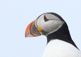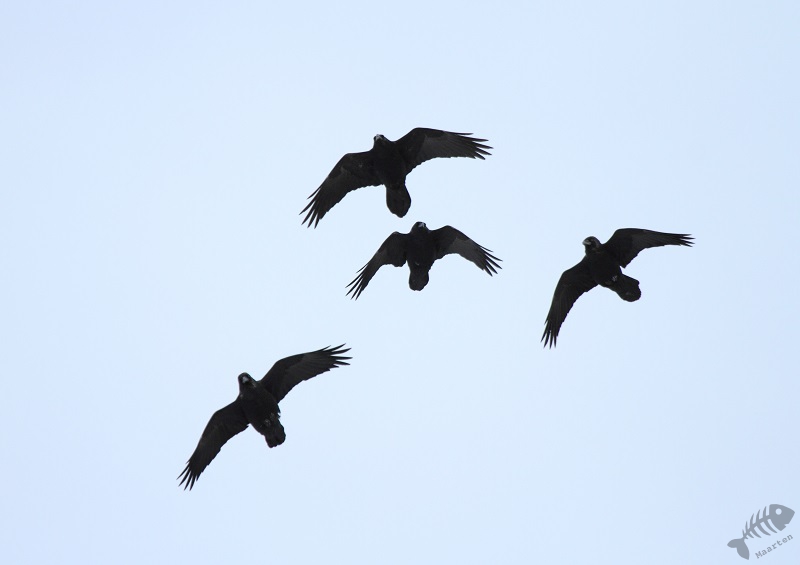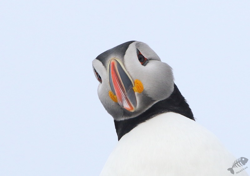 Toen ik naar de noordwestkant van de top was gelopen, zag ik weer enorme aantallen vogels op zee en zij vlogen allemaal naar de kliffen aan de westkant van het eiland. Toen ik de inkomende vogels goed ging bekijken, bleken er redelijk wat soorten te vliegen. Alken en Zeekoeten, maar ook Raven, Kuifaalscholvers, Drieteenmeeuwen, Zilvermeeuwen en: Papegaaiduikers! Ze zaten er dus wel. Ik heb me nog een tijdje beziggehouden met het vastleggen van vliegbeelden en heb toen de afdaling weer ingezet. Toen ik na de klauterpartij de hoek weer omging, zag ik al mijn mede Hornøya bezoekers druk bezig de tientallen Papegaaiduikers op de foto te zetten. Daar was dus iedereen en daar waren dus deze vreselijk leuke vogels. Omdat ik de nodige tijd verloren had, ben ik direct weer druk in de weer gegaan en heb een groot aantal Papegaaiduikers in verschillende poses vastgelegd.