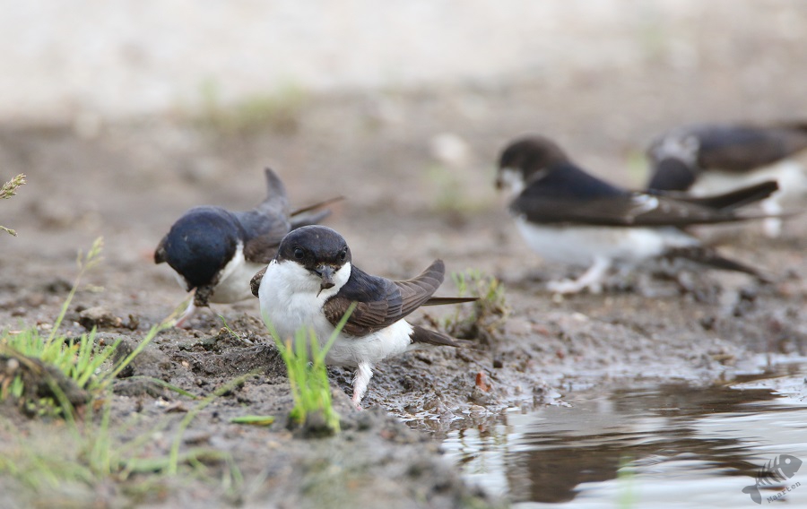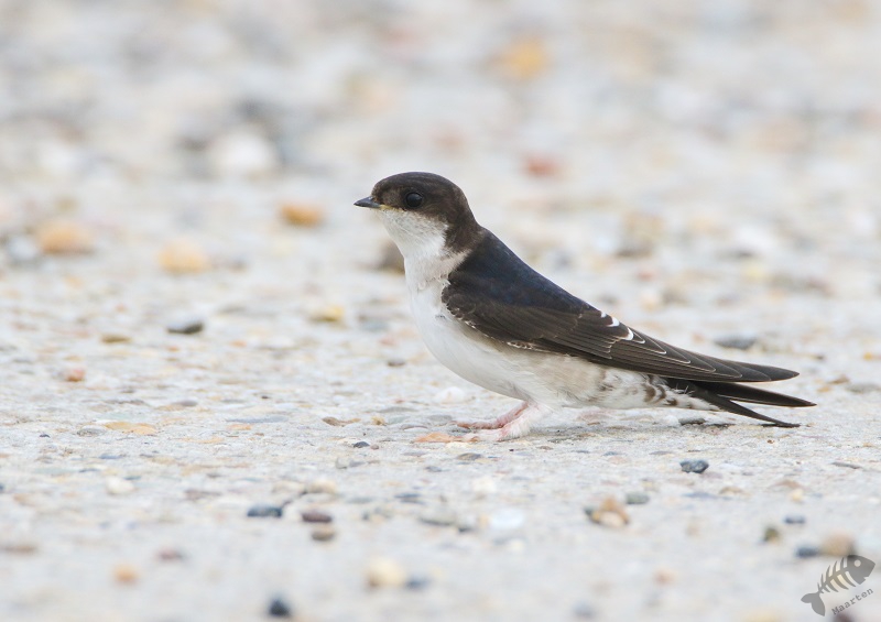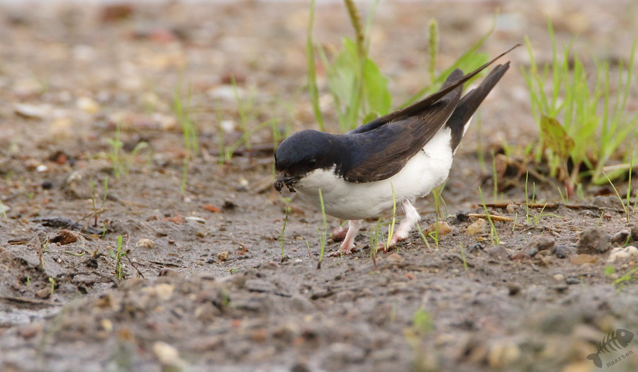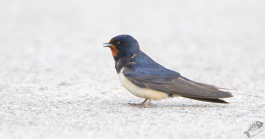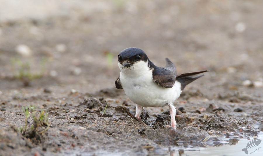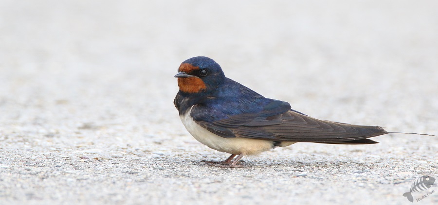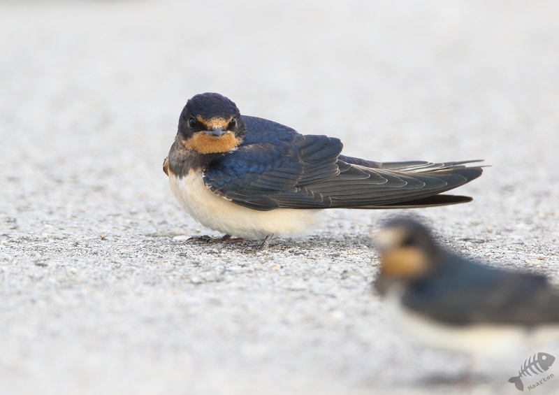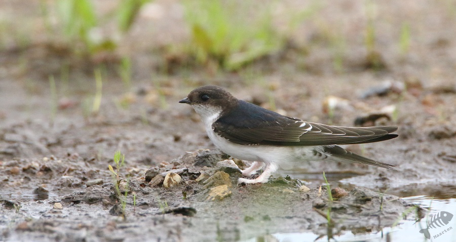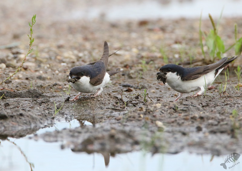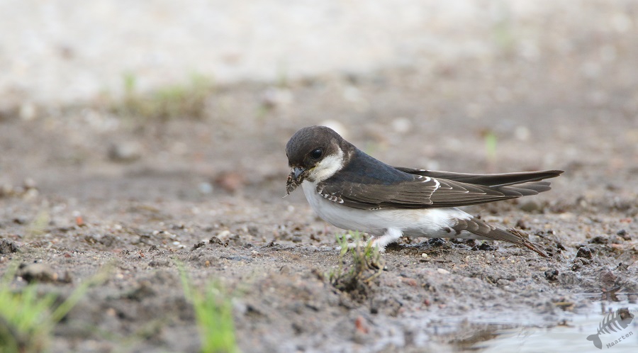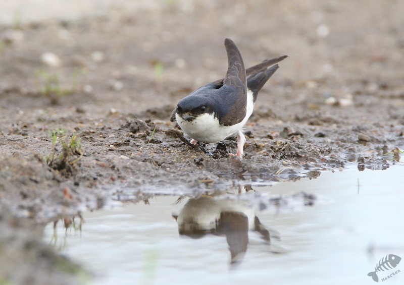 Op de t-splitsing zag ik weer aardig wat Huiszwaluwen, in de buurt staan verschillende boerderijen waar ze broeden, en tot mijn grote verbazing en verrukking landden ze bij het zelfde plasje langs de weg om modder te pakken, als waar ik ze 4 jaar geleden ook gezien had, maar toen onder zeer slechte lichtomstandigheden, zodat mooie foto’s maken toen eigenlijk niet ging. De omstandigheden waren nu stukken beter en ik kon de auto ook goed neerzetten, waardoor ik eindelijk eens de foto’s kon maken van deze prachtige soort, als waar ik al heel lang op hoop. Wat alleen een klein beetje jammer was, was dat ze natuurlijk hun mooiste verenpak niet meer droegen en die prachtige blauw/zwarte metaalglans minder te zien was. Ook kwamen er met name juvenielen (meer bruin in het verenpak) bij het plasje, wat leuk is, maar ik vind dat blauw zo mooi… Volgend voorjaar zoek ik hetzelfde plasje weer op…