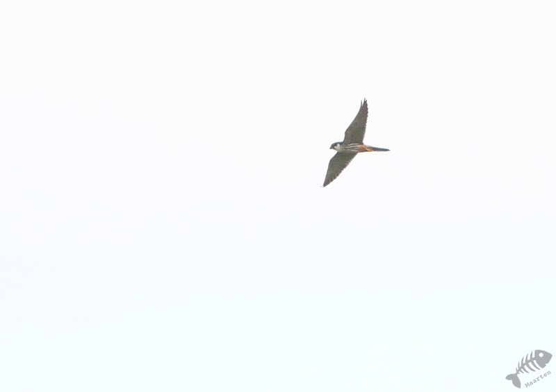 Terwijl ik daar stond zag ik in de verte ineens een hoop onrust onder de Zwaluwen en andere vogels. Toen ik goed keek, zag ik dat er een Boomvalk druk aan het jagen was en alles opjoeg! Wat een schouwspel! Helaas was de afstand erg groot, maar na enkele mislukte aanvallen, vertrok de Boomvalk weer en vloog iets meer naar mij, zodat hij in ieder geval kon worden afgebeeld in de lijst van vandaag. Wat een prachtige dieren zijn het toch!