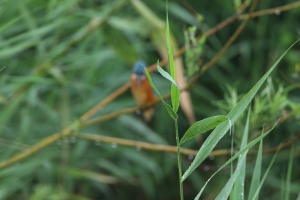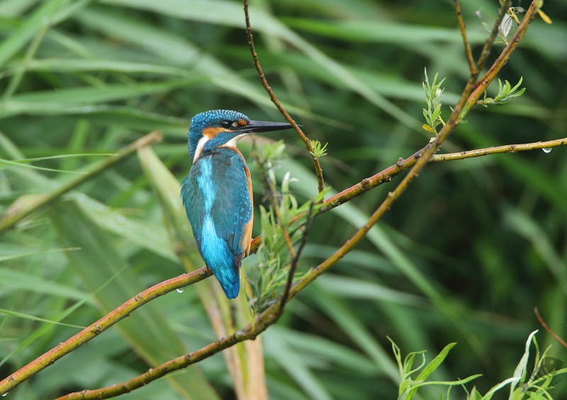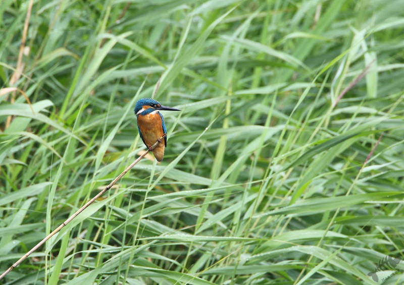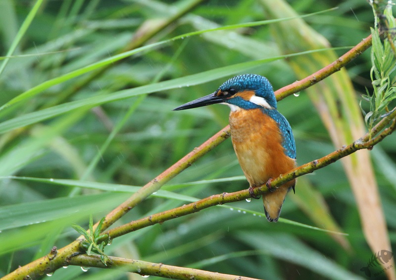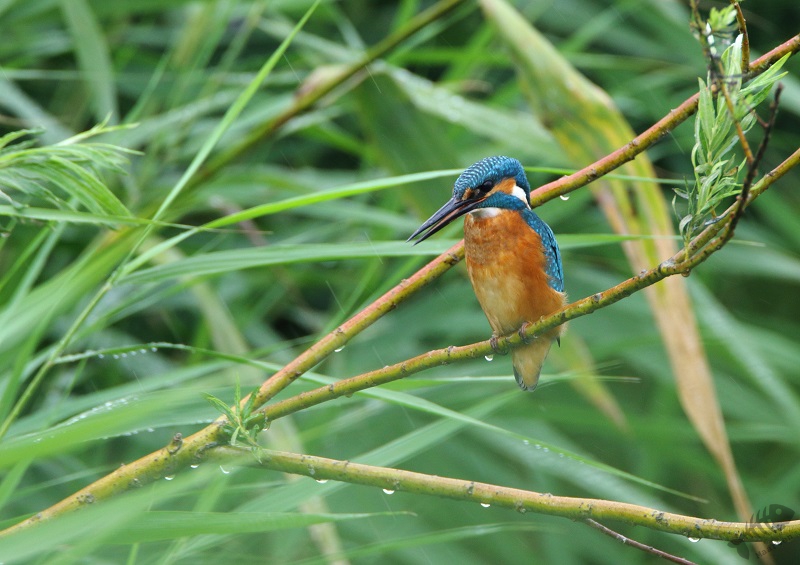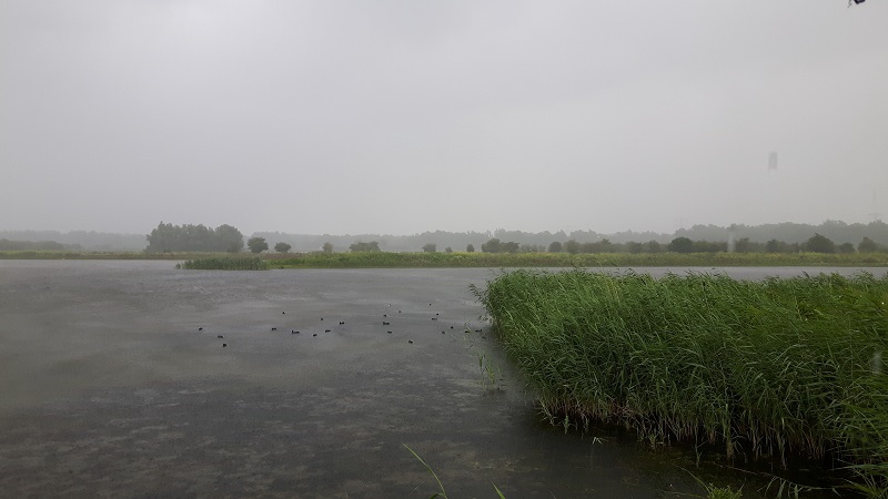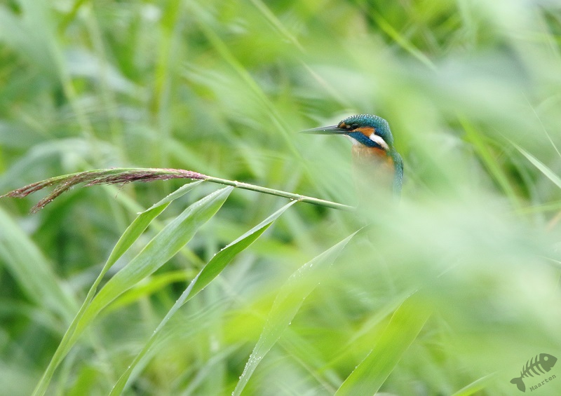 Het weer werd nog slechter: enorm harde wind en regenbuien joegen over de plassen en de vogels bleven ineengedoken op afstand. Door de harde wind gingen de buien wel weer snel voorbij en klaarde het weer iets op. De wind bleef, maar het was weer droog. Direct bleek dat de gelegenheid voor de IJsvogel te zijn om zich te laten zien. Hij ging in het riet links van de hut zitten en dook vanaf daar een aantal keer het water in. 1 Keertje had hij succes. Er kwamen verschillende fotomomenten en het was leuk om hem vanaf deze hut een keer anders op de foto te krijgen als op het bekende stokje. Na een tijdje vloog hij naar de rechterkant waar hij meer verscholen in het riet kwam te zitten, maar het me lukte om een sfeervol plaatje te maken van de IJsvogel in het riet.