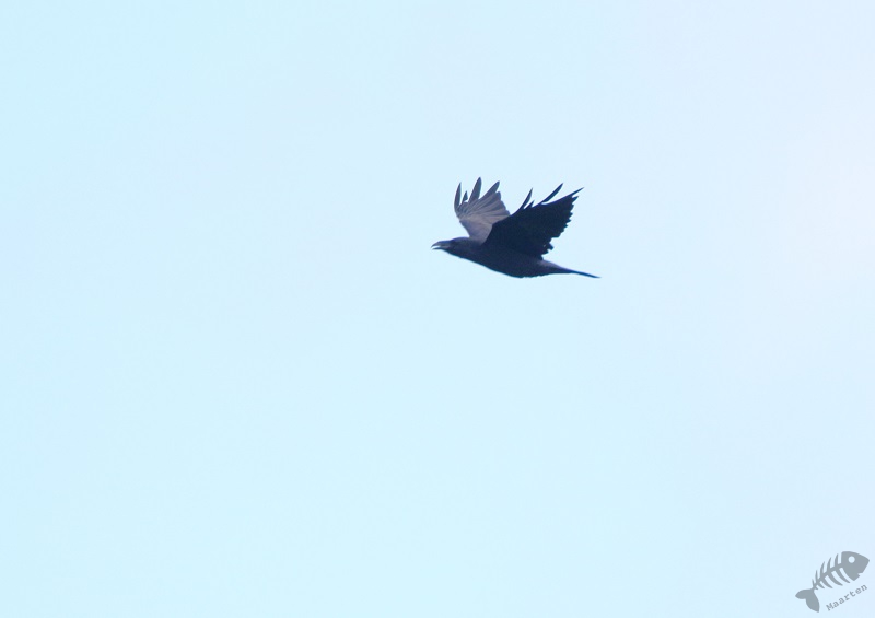 Daar zag ik al snel dat er nog heel wat Zwaluwen zaten, Boeren- en Huis-, maar ook nu weinig gelegenheid. Ik heb de weg richting snelweg afgereden om daar een kop koffie te pakken, om daarna maar naar de Oostvaardersplassen te gaan. Ik had de koffie net ingeschonken en daar verschenen ineens, uit het niets, tientallen Boerenzwaluwen. Ik kreeg nauwelijks de gelegenheid om te drinken in een poging de Zwaluwtjes in allerlei verschillende poses vast te leggen, waarbij ik na een tijdje bedacht had vliegbeelden te maken, wat wel een uitdaging was onder de betrekkelijke lichtomstandigheden. Terwijl ik daar mee bezig was, hoorde ik een heel mooi Wroh Wroh en wist meteen dat er een Raaf in de buurt zat. Het bleek er allen niet 1 te zijn maar 2 die wat verderop, achter elkaar, voorbij vlogen. Dat was wel een heel leuke “bijvangst”. Zeker ook omdat ze zo’n mooi geluid erbij maakten. Toen ik uiteindelijk toch aardig tevreden was met alle resultaten, ben ik weer langzaam terug gereden om naar de Oostvaardersplassen te gaan.