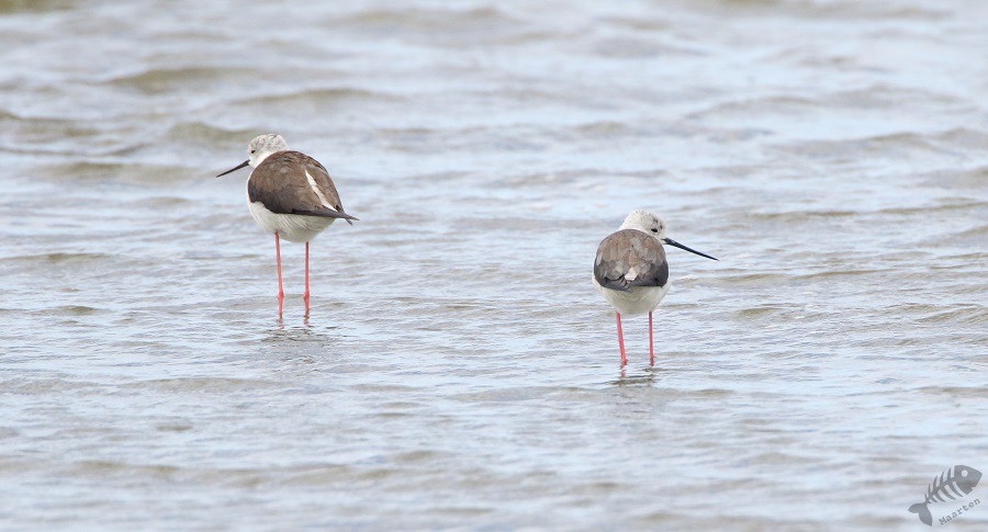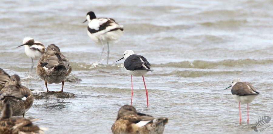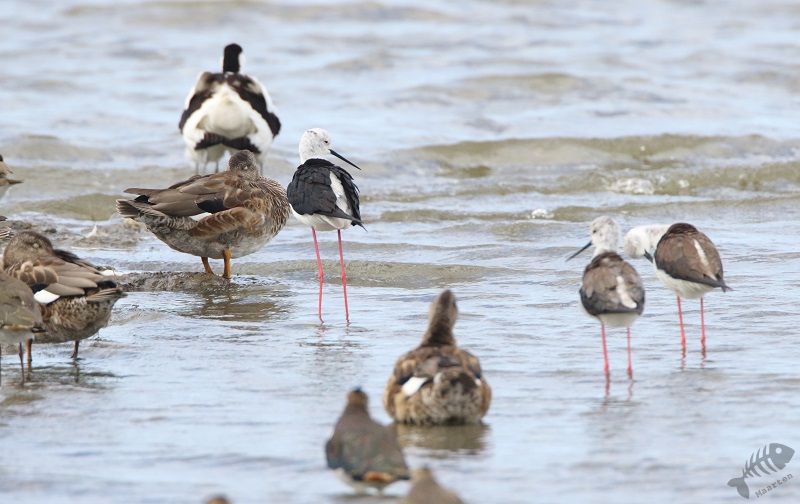 In de Krakeend zat een mede-vogelaar waar ik al eerder, in de Oeverloper, mee gesproken had (hij had me geattendeerd op het gebied “het Harderbroek” wat ook heel interessant kan zijn, zeker in het voorjaar). Nu wees hij me op een aantal Steltkluutjes die voor de hut zaten. Ik had deze soort eerder voor deze hut gezien, maar toen vanaf de Poelruiter en dus op grote afstand, nu stonden ze op maar een paar meter! Het waren 2 volwassenen en 3 jongen. De jongen waren redelijk actief en liepen wat rond, de oudere stonden stil en (deden alsof ze) sliepen. Toch kon ik verschillende foto’s maken en kon ik weer een nieuwe soort aan mijn fotolijst toevoegen. Verder liepen er op het eilandje voor de hut kieviten rond, verschillende Eenden en een Oeverlopertje (bij de verkeerde hut dus…). Aan het einde van mijn bezoek vloog er nog een Lepelaar naar de andere kant van de hut en ging daar enthousiast aan het foerageren.