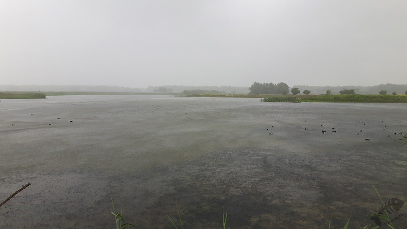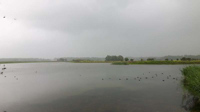 Toen ik een blik door 1 van de (veel te kleine) kijkgleuven wierp, vloog er meteen een IJsvogeltje weg. Heel jammer natuurlijk en zeker ééntje die ik hier niet verwacht had. Misschien wilde hij terugkomen… Verder zaten er verschillende Eenden, maar daar bleef het wel bij. Het weer werd er ook niet beter op en ik bedacht maar naar de Poelruiter te lopen, aan de overkant van de Praamweg, voordat het te nat zou gaan worden. Een jonge Blauwborst hield me nog even op, waarna ik naar de andere hut kon gaan. Er zaten verschillende fotografen te wachten op een IJsvogel en het bleken écht allemaal kenners van IJsvogels tot Steltkluten, tot Visarenden… Maar goed, als het dan maar niet voor niets zou zijn.