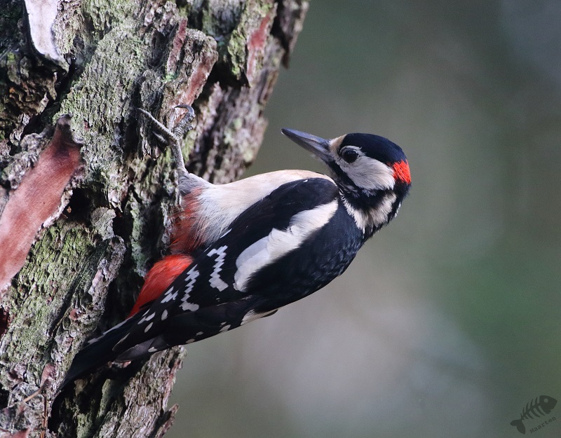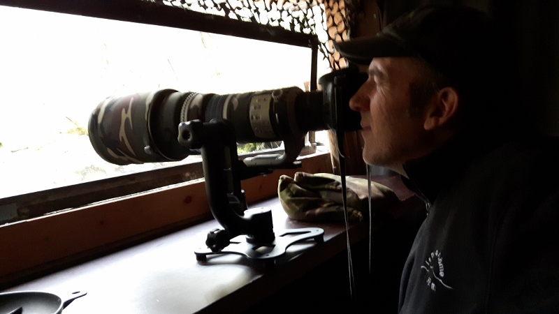 Het werd toen wel weer stil voor de hut. De frequentie waarmee de vogels kwamen, nam af maar het geluid van de Zwarte Specht hield me alert! Ik hoorde hem een aantal keer ruim om de hut heen gaan, verschillende kenmerkende geluiden maken, maar helaas ging hij niet voor de hut zitten (de boom welke Glenn geprepareerd had om ze naar de hut te lokken, hadden ze ook al grotendeels ontdaan van zijn bast, zodat ze er nu even niet meer zoveel te zoeken hadden misschien…). Ook hoorde ik het geluid dat van een Havik kon zijn, maar dat was maar even en ik ben er dus niet zeker van. gezien heb ik hem zeker niet.