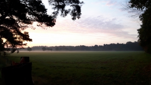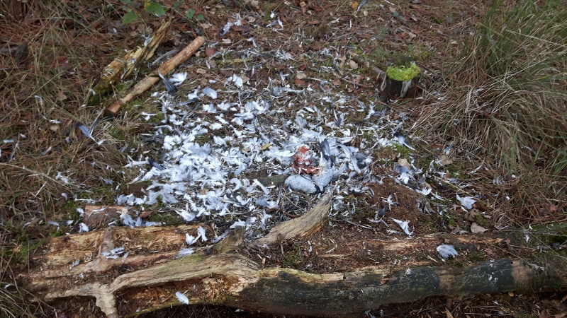 19 Oktober was het dan zo ver. Ik hoefde gelukkig niet zó vroeg weg: we hadden afgesproken op een plek in de buurt van de hut om half 9 in de ochtend. Om zeker op tijd te zijn ben ik om half 7 vertrokken en was ik 20 minuten voor de afgesproken tijd aanwezig. De omgeving was prachtig . Kleinschalige landbouw, omgeven door verspreide bossen. Nadat Glenn gearriveerd was, zijn we nog een klein stukje verder gereden en kwamen we bij de plek waar ik mijn auto kon parkeren. Het laatste stuk reden we in zijn auto. We zaten inderdaad midden in de bossen en het was er heerlijk stil. Nadat Glenn uitgelegd had hoe ik weer bij mijn auto kon komen (kwartiertje lopen), hij nog wat tips had gegeven, wat voer had verspreid en aas (duif) voor de Havik en/of Buizerd had neergelegd, kon ik plaatsnemen in de hut en kon het beginnen!