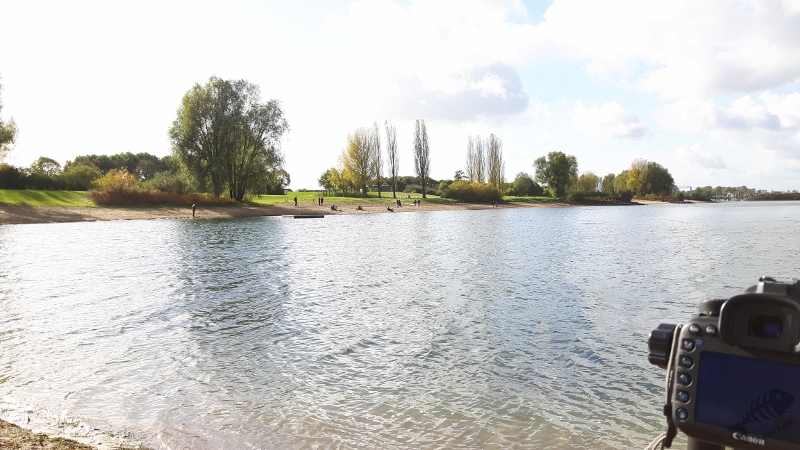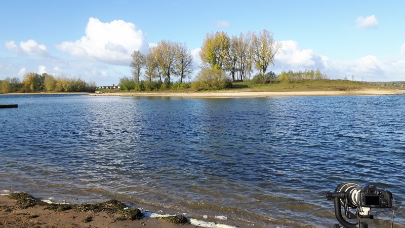 De vogel werd gezien in een recreatieplas, de Rhederlaag, en bij aankomst heb ik snel de auto neergezet en ben opzoek gegaan. Ik zag alleen niet veel: wat Meerkoetjes en Kuifeendjes en dat was het wel. Ik heb daarop op waarneming nog eens goed bekeken waar het zou moeten zijn (het verbaasde me toch wel een beetje dat er niet meer vogelaars waren) en het leek dat ik niet goed zat. Een vriendelijke dame, die me vroeg wat er toch te zien was, bevestigde dat. Zij wist te vertellen dat er iets verderop een groot aantal vogelaars stond. Ze vertelde hoe ik daar kon komen en ik ben daarop snel die kant opgegaan.