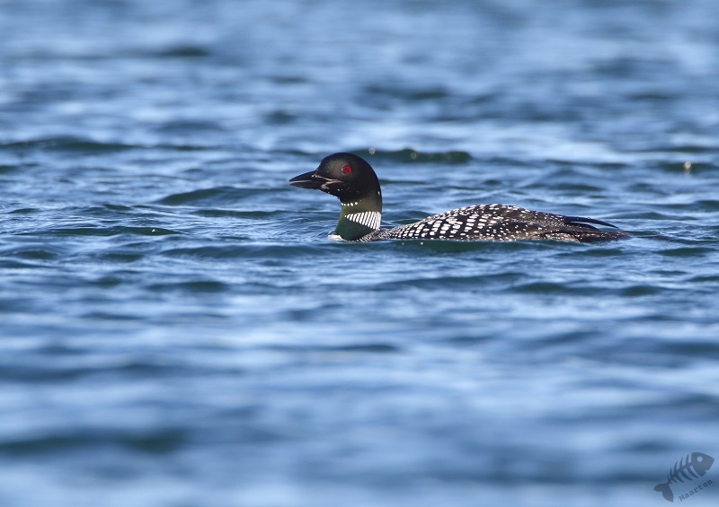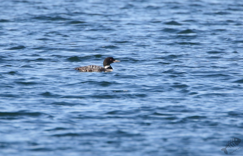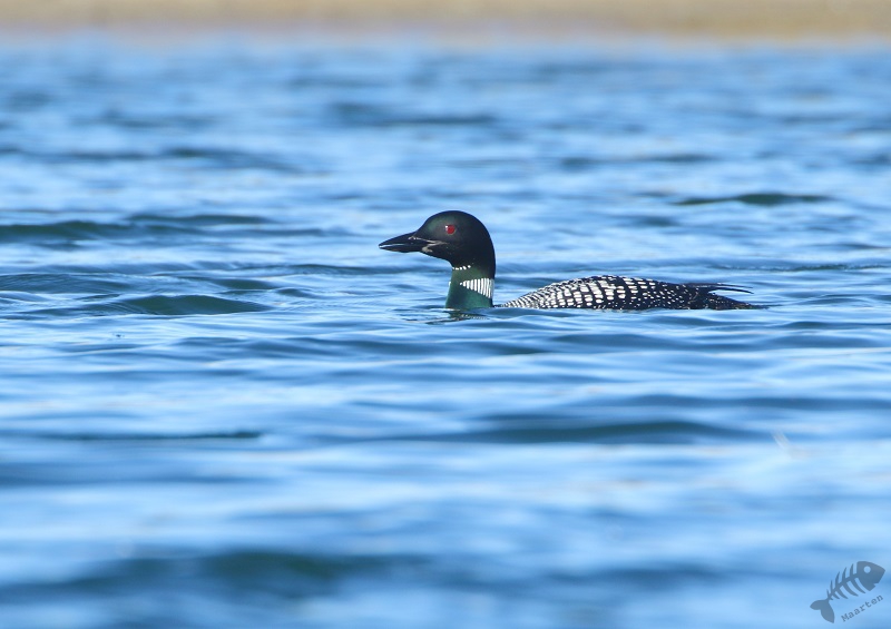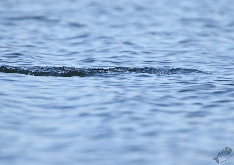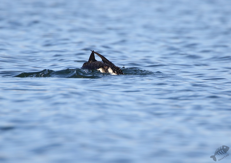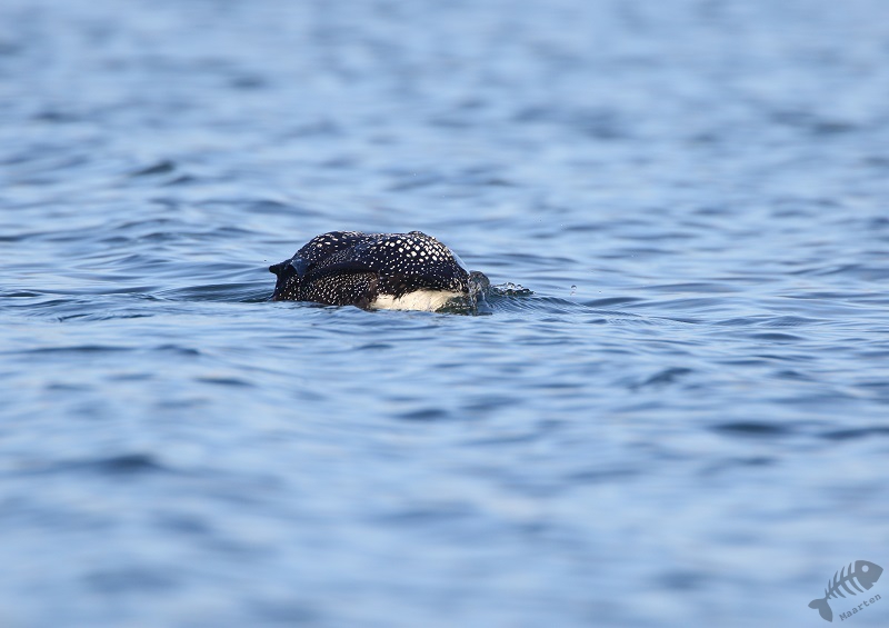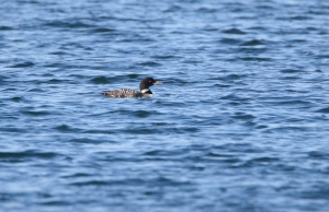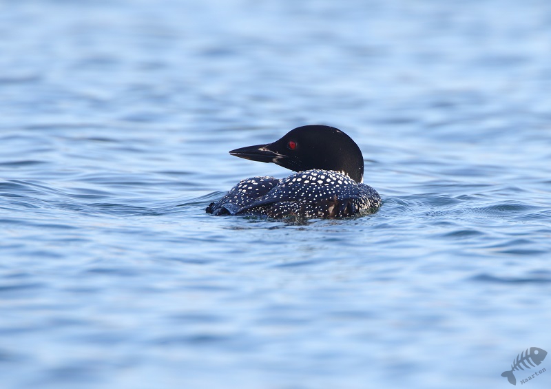 En inderdaad: er stond een hele bubs aan auto’s en op een strandje een aantal vogelaars/fotografen. Ik heb een plekje gezocht en raakte aan de praat met 2 buren. Zij vertelden dat de Duiker even daarvoor vlak voor hen langs gezwommen was en wezen waar hij nu zat. Hij zat iets verderop, maar ik kon hem aardig in beeld krijgen: wat een prachtige vogel! Snel heb ik verschillende plaatjes gemaakt, om hem maar vast te hebben, en toen moesten we afwachten wat hij zou doen. Het leek of hij een rondje rond een eilandje zou gaan zwemmen, waardoor hij even uit ons beeld verdween, maar dan later weer voor ons langs zou komen. Na enige tijd kwam hij inderdaad weer tevoorschijn, maar hij bleef net te ver weg. Ik ben daarop zijn kant opgelopen (wat ik eigenlijk altijd probeer niet te doen: de ervaring heeft zo langzamerhand geleerd dat dat vaak niet helpt. Vogels komen vanzelf dichterbij en gaan anders juást naar de plek waar je vandaan komt…) en heb een nieuwe plek gezocht. Ook daar raakte ik weer aan de praat met een enthousiaste vogelaar en samen hebben we ons geluk afgewacht. Op een gegeven moment kwam de Duiker inderdaad dichterbij. Hij was alleen heel onpeilbaar. Wanneer hij onderdook, kon je met geen mogelijkheid voorspellen waar hij weer boven zou komen. De ene keer dus dichterbij, de volgende weer verder.
