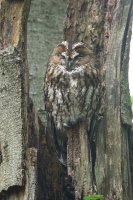 Terwijl ik daar zo mee bezig was, werd ik verschillende keren aangesproken door mensen die in het bos hun hond aan het uitlaten waren. Het leuke was dat iedereen enthousiast was, geen vervelende vragen als: “wat ziet u”, of opmerkingen als: “dat is een groot fototoestel”, maar heel geïnteresseerd en wat vooral leuk was: de meeste mensen kende de Uil. Ik kreeg een beetje de indruk dat hij beschouwd werd als de troetel-uil van het Landgoed Duno. Ook was het leuk dat ik van 2 verschillende dames de tip kreeg dat er verderop nóg een Bosuil zou zitten. Aangezien ik er toch was (en deze Uil niet zo heel actief was) ben ik gaan kijken of ik deze Uil ook kon vinden. Helaas was dit niet gelukt.