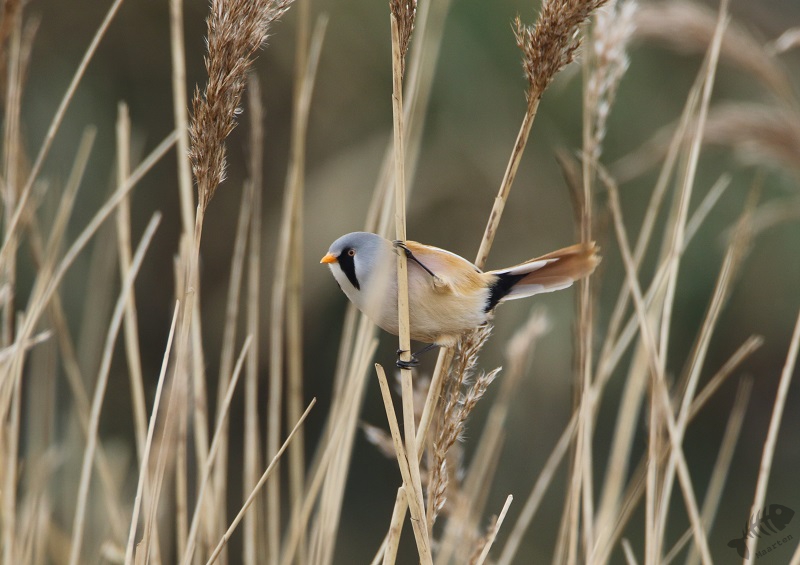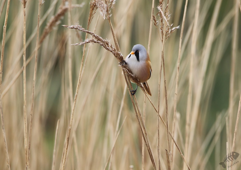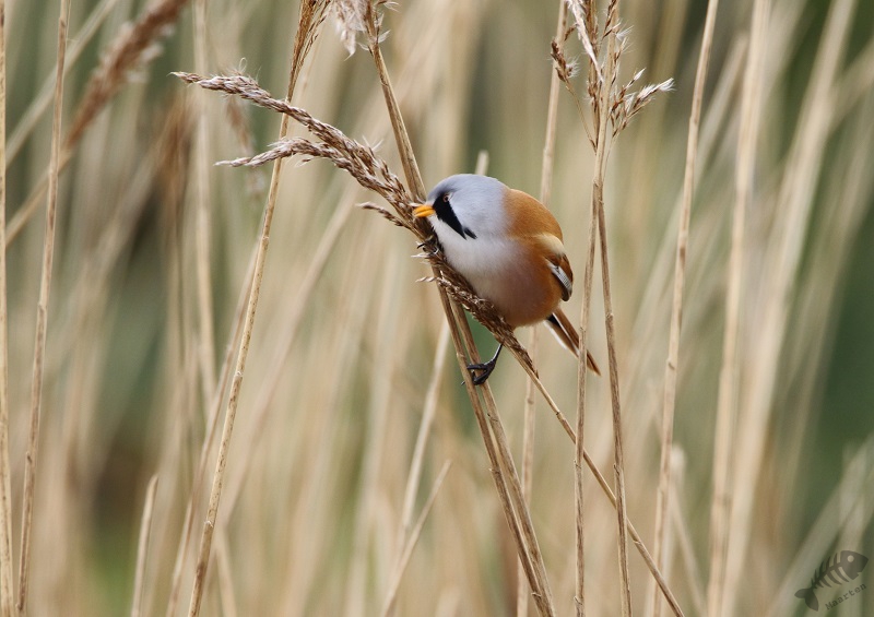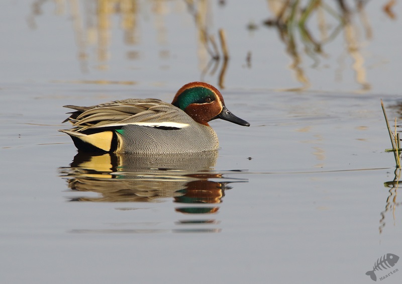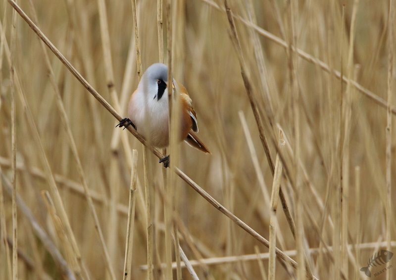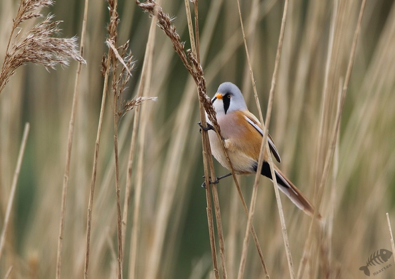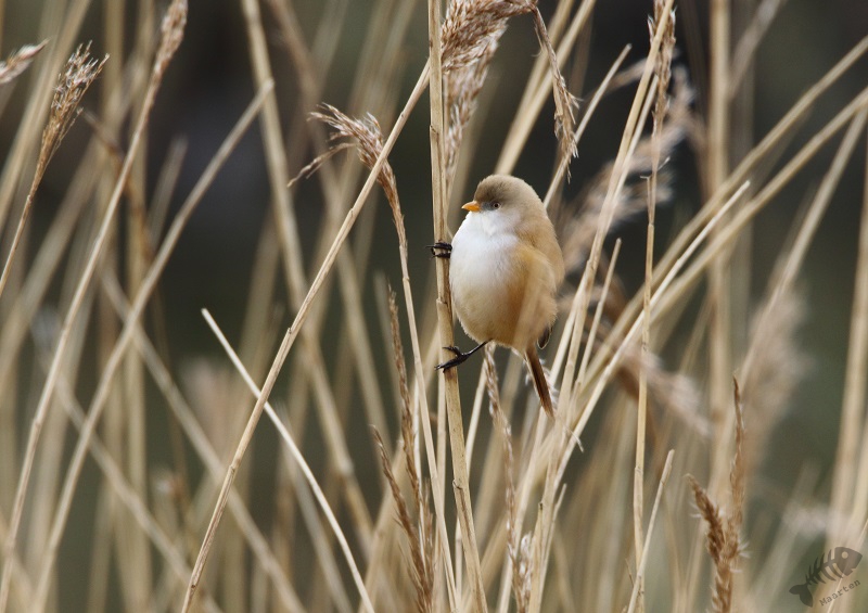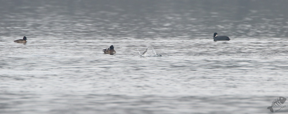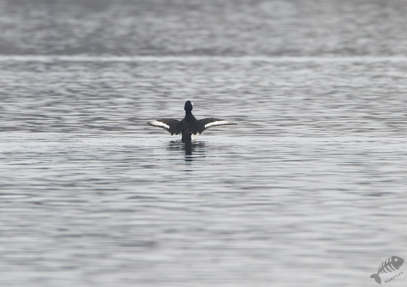 Ik dacht ook nog maar even bij het gemaal te gaan kijken, daar wil ook nog wel eens iets leuks zitten, en ben dus langzaam die kant opgereden. Er zaten verschillende Smienten, maar verder was het rustig. Ik raakte aan de praat met een andere vogelaar die voor het eerst in de Polder was en plotseling hoorden we een kenmerkend Ping van de overkant van het Wiel. Baardmannetjes! We zijn het water overgestoken en hebben op de dijk staan wachten tot de Baardmannetjes zich weer zouden laten zien. Maar het bleef stil… Waren ze weg? Maar nee: na een paar minuten kwamen ze weer “Pingend” naar boven geklommen in het riet en lieten ze zich fraai zien. Ondanks de, toch wel iets te, grote afstand, waren de foto’s heel aardig geworden. Het was al een hele tijd geleden dat ik ze mooi gezien had, laat staan het mannetje mooi gefotografeerd had. Toen ze verder gevlogen waren, ben ik de dijk weer even opgelopen, waar een Fuut zijn dreiggedrag op een Kuifeend aan het oefenen was. Verder zag ik groepen Kuifeenden, Meerkoeten en een koppeltje Brilduikers. Ook vloog er een aantal Nonnetjes het water op, maar deze laatste 3 bleven op grote afstand (en het “timen” zat niet helemaal mee…).