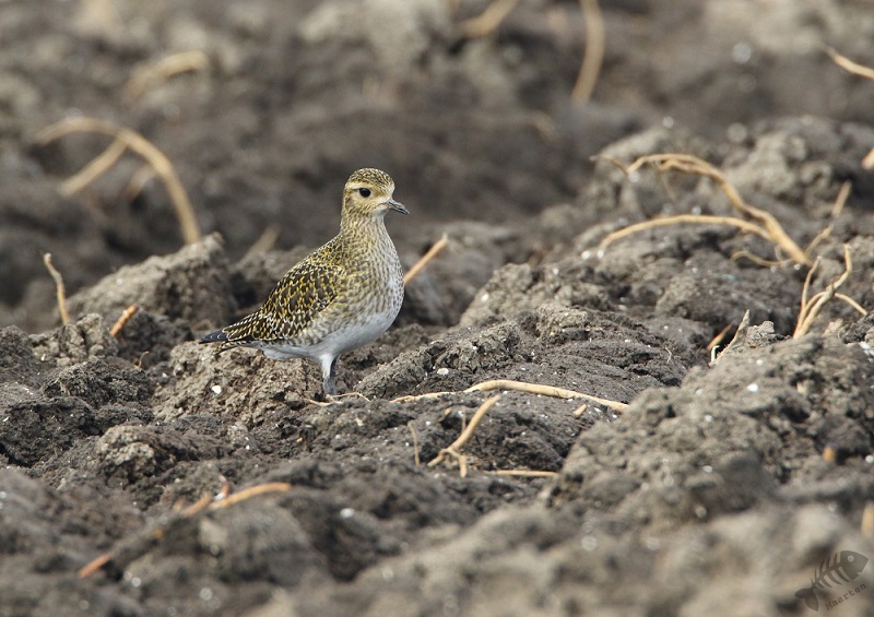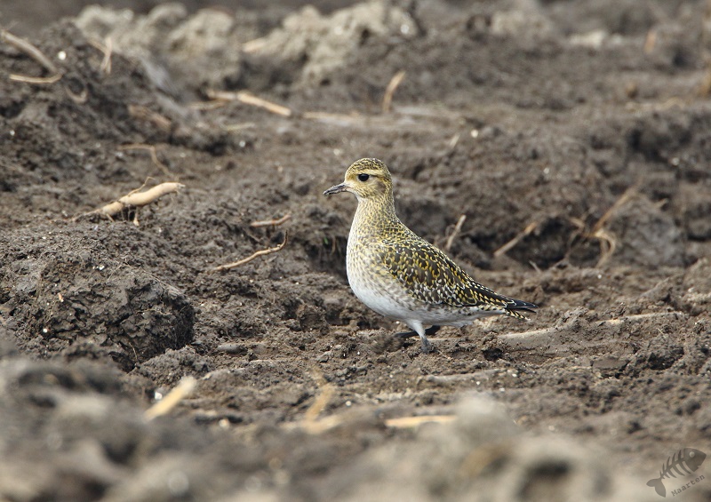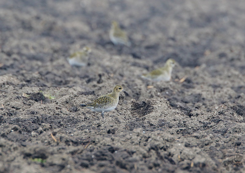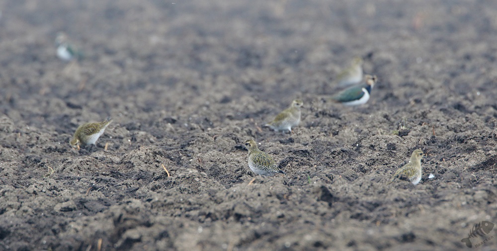 Ik bedacht weer eens iets anders te rijden. Een aantal jaar geleden heb ik úren doorgebracht aan de Dodaarsweg om Blauwe Kiekendieven te fotograferen. Ondanks dat ik nergens gezien had dat ze er weer zouden zitten, vond ik het toch een goed idee te gaan zien hoe het er nu uitzag en wat er te zien zou zijn. Ik vond de weg weer snel en ben de dwarsweg ingereden waar toen de Kiekendieven zaten. Al snel zag ik grote aantallen Kieviten, een Buizerd, maar geen Blauwe Kiekendieven. Helaas… Maar toen zag ik wat schimmige gestalten rondscharrelen over de omgeploegde akkers. Het bleken Goudplevieren te zijn. Alweer was ik onder de indruk van de schoonheid van een vogel die ik deze dag zag. Dat goudgeel in die donkere akker leek als vinden van een goudklomp in donkere aarde. Niet gelogen, oprecht weer prachtig! De naam van deze soort is weer zeer goed gekozen…