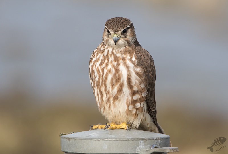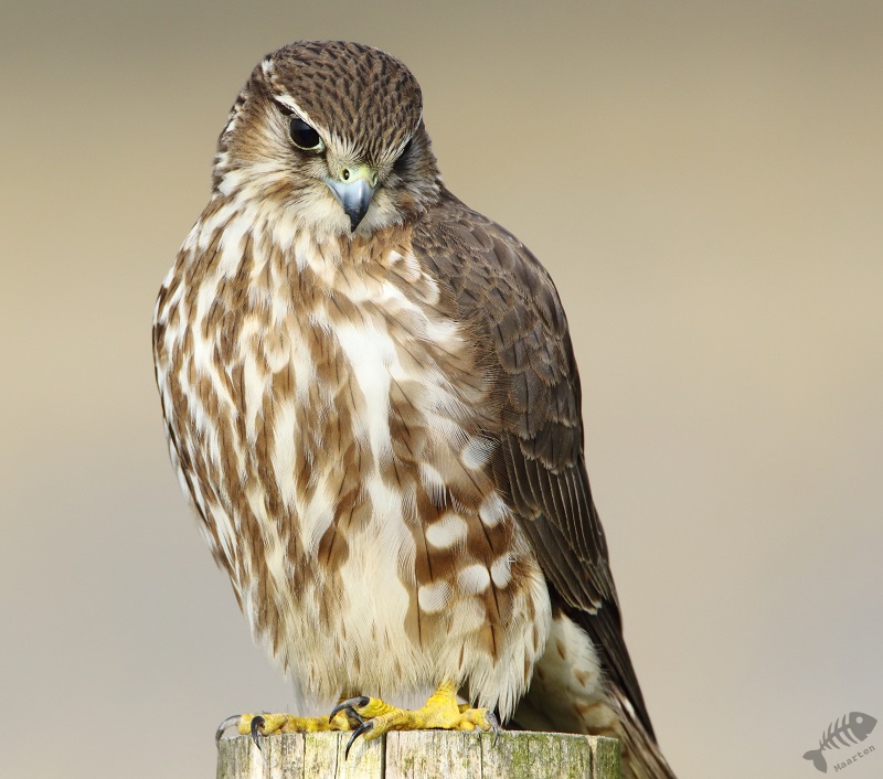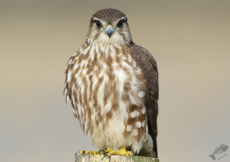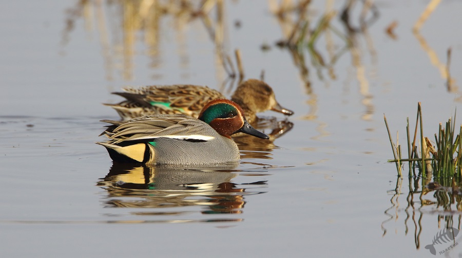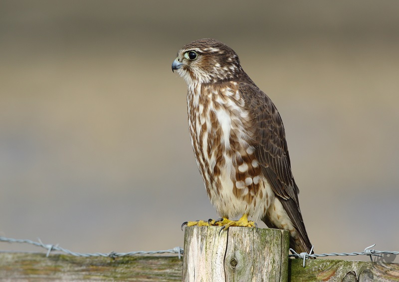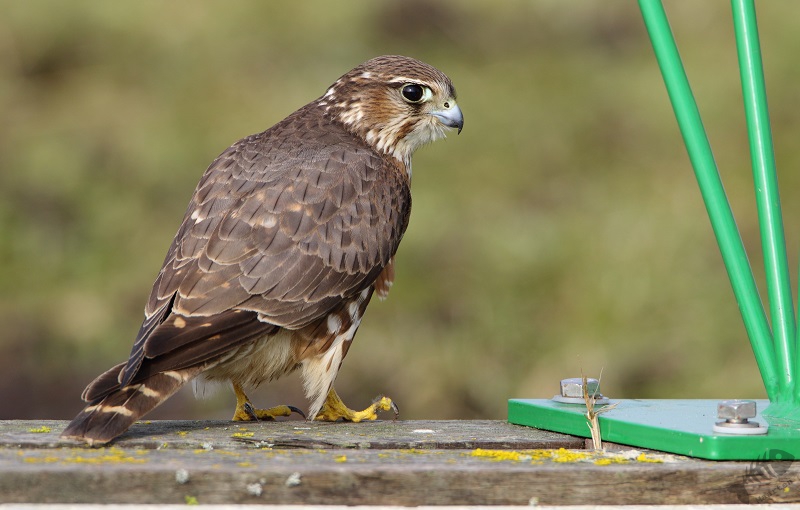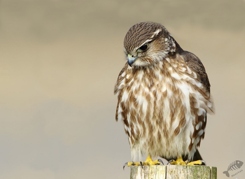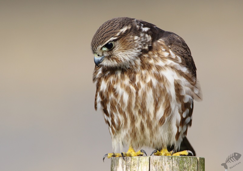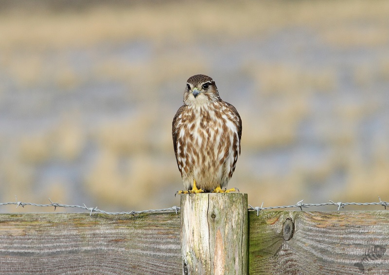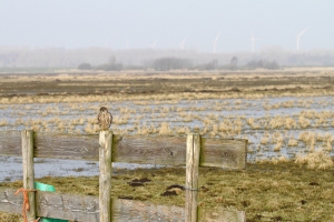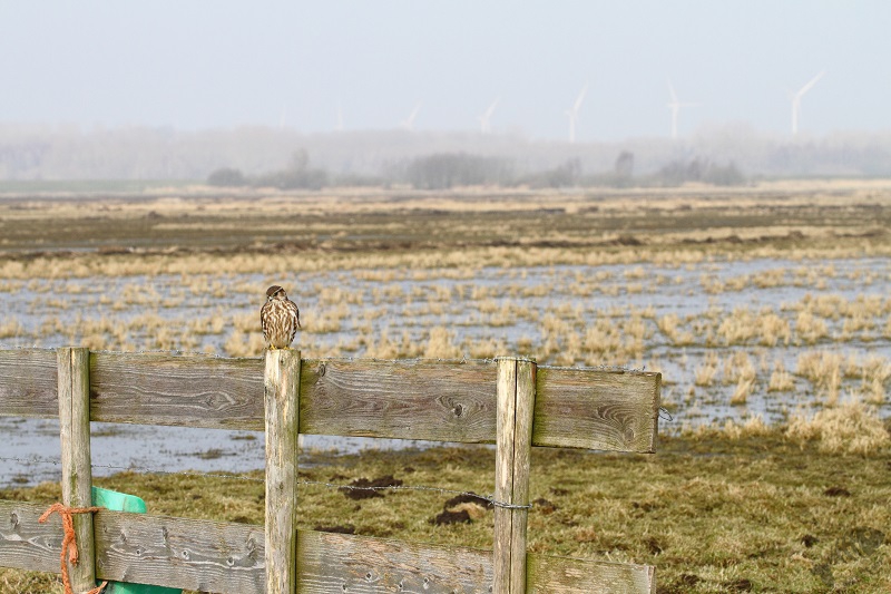 Iets verder zwommen enkele Wintertalingen: wat een prachtige Eendjes zijn dit toch! In eerste instantie zwommen ze wat weg, maar daarna zwom een koppeltje naar me toe en kwam op een mooie afstand voorbij. Zelden kreeg ik ze mooier in beeld! Na ook nu weer helemaal tevreden te zijn geraakt, ben ik weer verder gereden en zag ik ineens vanuit mijn ooghoek een kleine vogel aan mijn linkerkant op een pijlpotdeksel zitten. Ik keek meteen vol aandacht en…: het was het Smelleken! Ik reed een klein stukje verder, ging scheef in de berm staan en dacht dat ze nu wel meteen zou vertrekken. Maar wat schetste mijn verbazing: ze bleef zitten! Half uit mijn raampje hangend, achteruit fotograferend kreeg ik mijn lang gehoopte foto’s van dit fraaie Valkje. Na een klein poosje sprong ze op een houten vlonder en kwam ze nog dichterbij. Daarna vloog ze op een hek en bleef daar nog een tijdje druk de grond af speuren. Ik heb in korte tijd een aantal 100 foto’s gemaakt, maar toen een aantal fietsers verscheen, vond de kleine dame het genoeg en vloog weg. Wat een ervaring en wat een prachtige kleine jager! Schitterend!