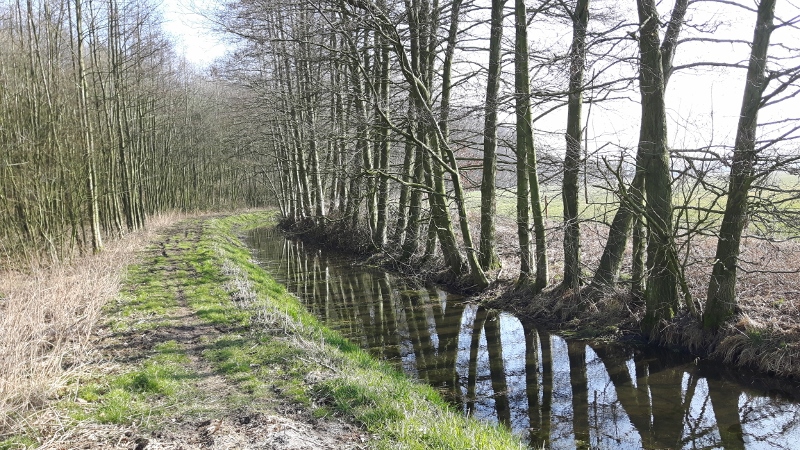 Milsbeek ligt aan de overkant van de Maas, vanaf Cuijk gezien, en vroeger fietste ik daar nog wel eens heen om vogels te gaan kijken, of gewoon een stuk te fietsen. Ik ben er al jaren niet meer geweest en had er geen idee van dat het wel eens een heel interessant gebied zou kunnen zijn. Zoals ik al schreef zag ik de laatste dagen van februari en begin maart dat er steeds vaker Houtsnippen gezien werden. Het was in deze periode enorm koud geweest met flinke nachtvorst en overdag net onder het vriespunt of erop met een zeer venijnige, harde oostenwind. Het was dus ook enorm droog geworden en ik denk dat dat de rede was dat veel Houtsnippen naar open slootjes en watertjes trokken. Hoedanook: ze werden gezien en aangezien ik er, naar mijn weten, nog nooit één gezien had (misschien tijdens een vogelkamp op Schiermonnikoog, maar dat weet ik niet meer zeker), ben ik op de eerste dag dat ik gelegenheid had naar de plek gegaan waar een Houtsnip, Watersnip én Bokje gezien waren. Op Google Maps leek het bij een, door bomen omzoomd, beekje te zijn aan de rand van het Reichswald, onder aan een stuwwal.