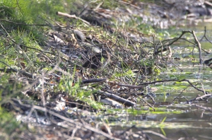 Al vrij snel na mijn aankomst vertrok één van de vogelaars en kon ik mijn auto iets anders neerzetten. Het scheelde niet veel voor het uitzicht (en zeker niet voor de aanwezige soorten…), maar wel zag ik achter mij 2 Barmsijsjes rondscharrelen. De nog aanwezige vogelaar had ze ook opgemerkt en het bleek dat er eentje ongeveer onder zijn auto bezig was waardoor ik hem niet in beeld kon krijgen! Ik stond nog steeds op een slechte plek…