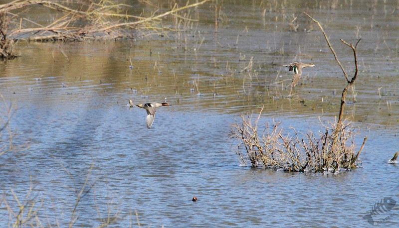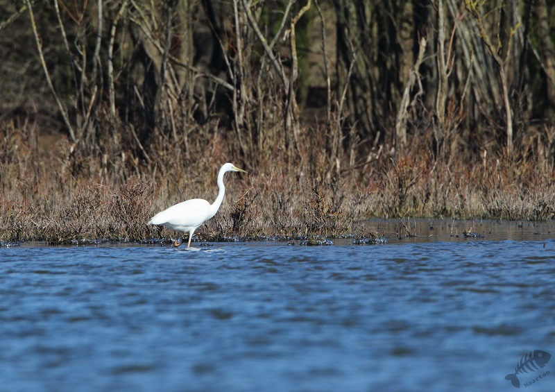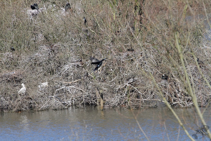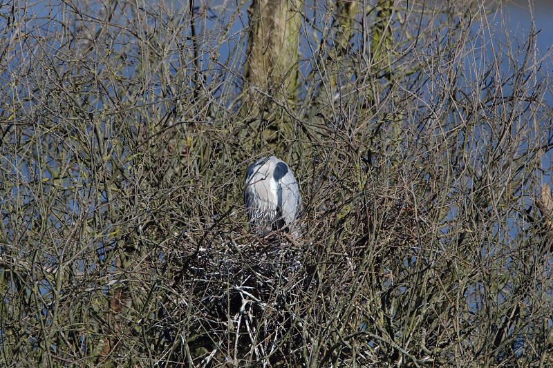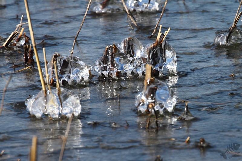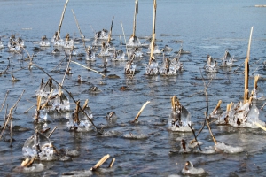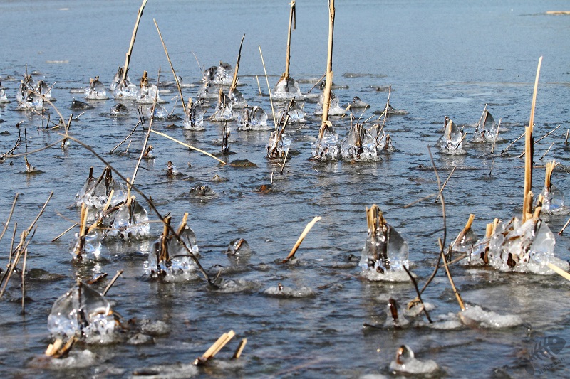 Nadat ik de auto had neergezet, ben ik aan het rondje begonnen maar werd al heel snel opgehouden door een aantal vogels welke in een weitje aan het foerageren waren. Het leken Grote Lijsters en met deze soort heb ik altijd moeite, dus ik wilde nu best wat tijd uitrekken om te proberen deze prachtige zanger vast te leggen (ik vind hun zang heel mooi: heel melodieus en beetje melancholiek…). Ze waren behoorlijk schuw, wat mijn vermoeden dat het Grote Lijsters zouden zijn alleen deed versterken, en ik heb flink wat foto’s gemaakt. Toen ik dacht dat ik genoeg had, ben ik weer verder gelopen richting de schuilhut. Er vlogen enkele Lepelaars en in de verte stond een Grote Zilverreiger te vissen. Op de loopbrug werd ik eerst opgehouden door ijs… Er waren ijssculptuurtjes tegen plantenstengels ontstaan en dit zag er prachtig uit. Ik kon het niet laten er ook enkele foto’s van te maken, maar werd al snel afgeleid door een Tureluurtje aan de overkant. Bij de hut bleken de Aalscholvers al weer druk in de weer hun nesten op orde te krijgen. Ze vlogen af en aan met takken wat een Blauwe Reiger blijkbaar niet meer kon aanzien en z’n kop wegstak.