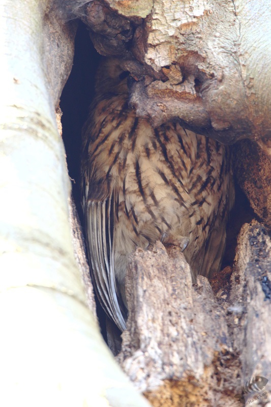 Ik ben er ’s ochtends rond 9 uur heengereden, dan valt het licht ook het mooist in het bos op de boom van de Bosuil. Toen ik er eenmaal aangekomen was, kon ik de boom niet meer terugvinden! Ik was op de juiste plek, maar zag het gat niet meer en daarmee natuurlijk ook de Uil niet. Na zo’n 10 minuten verdwaasd rond te hebben gelopen, ben ik iets teruggegaan naar het fietspad en daar zag ik hem weer! Ik was hem gewoon voorbij gelopen…