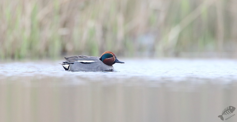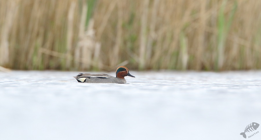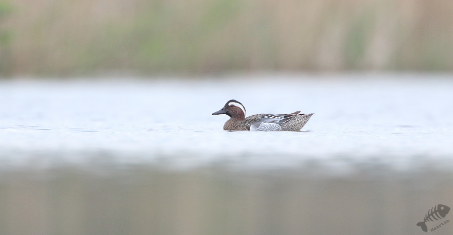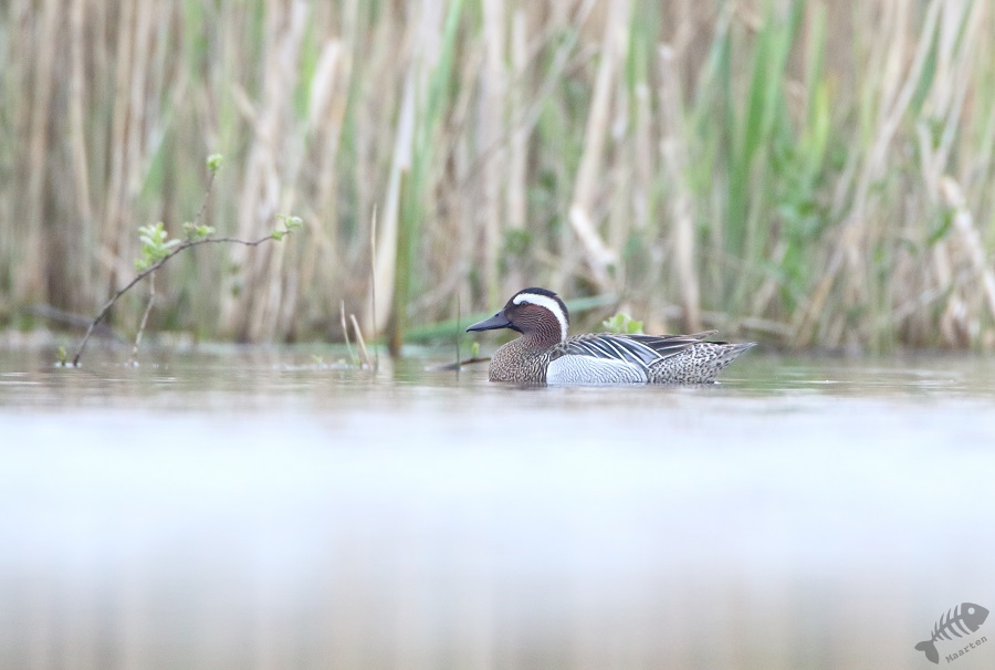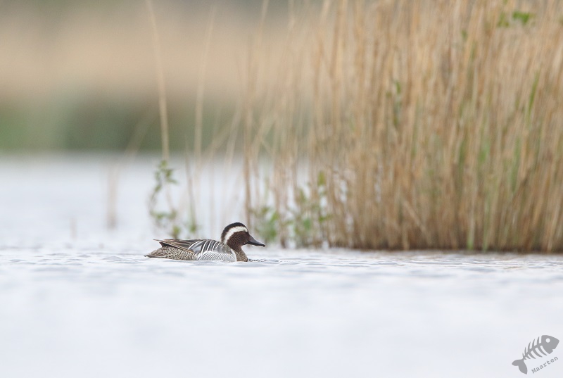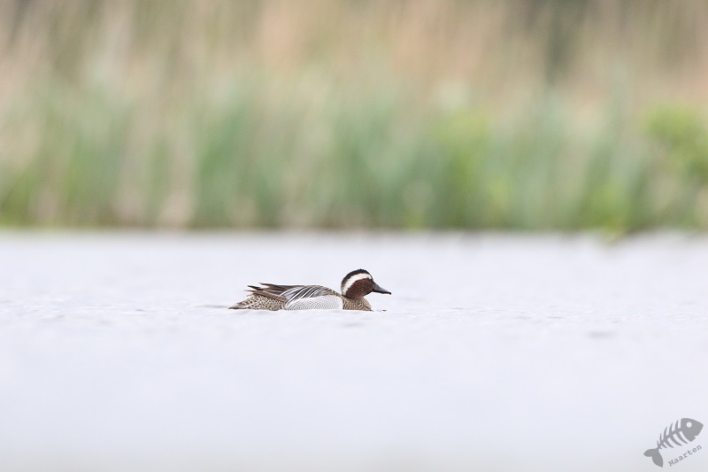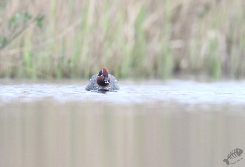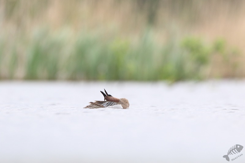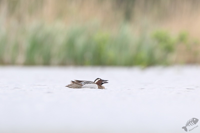 Het licht werd harder en op de plas voor de hut werd het steeds rustiger. Ik hoorde links en rechts uit het riet wel geluiden komen, maar de genen die deze geluiden maakten, lieten zich zelden zien. Er zat een geluid bij wat ik totaal niet kende. Het leek een beetje op een knorrend Varkentje, maar die verwachtte ik eigenlijk niet hier… Op een bepaald moment verscheen er een Zomertaling recht voor de hut en hij was volop bezig indruk te maken op de vrouwtjes. Op een bepaald moment opende hij zijn snavel, gooide zijn hoofd in zijn nek en deed dit vol overgave al knorrend! Hij, of de mannelijke helft van de Zomertalingen dus, zijn de makers van dit typische geluid. Ik had dus weer wat geleerd.