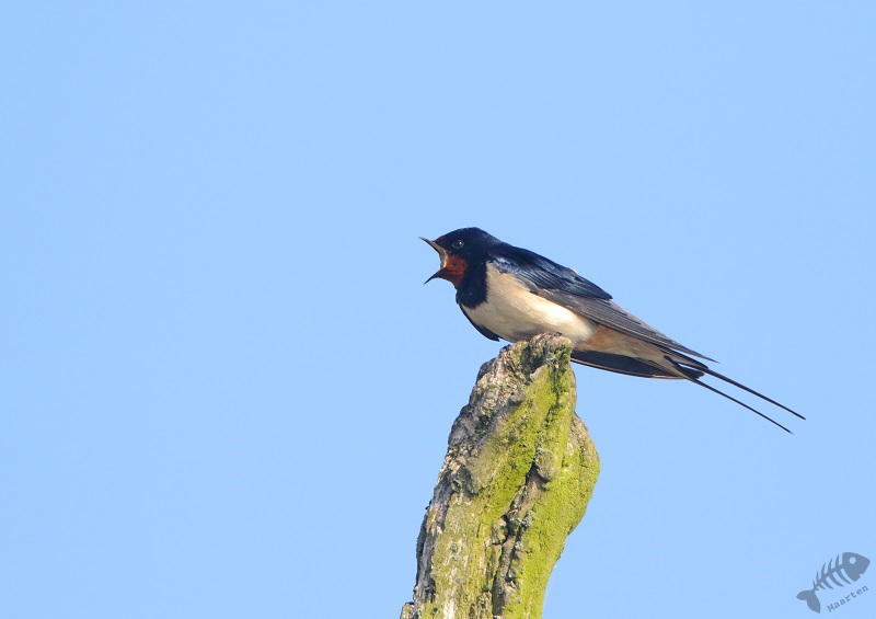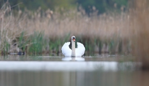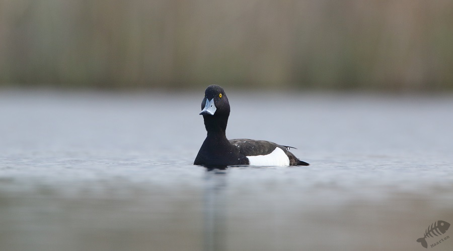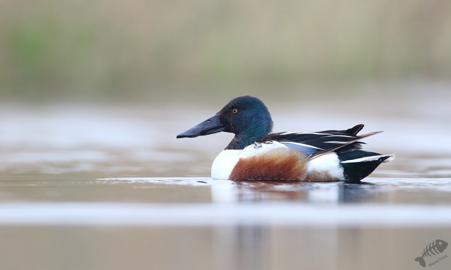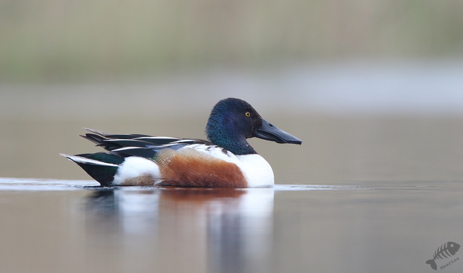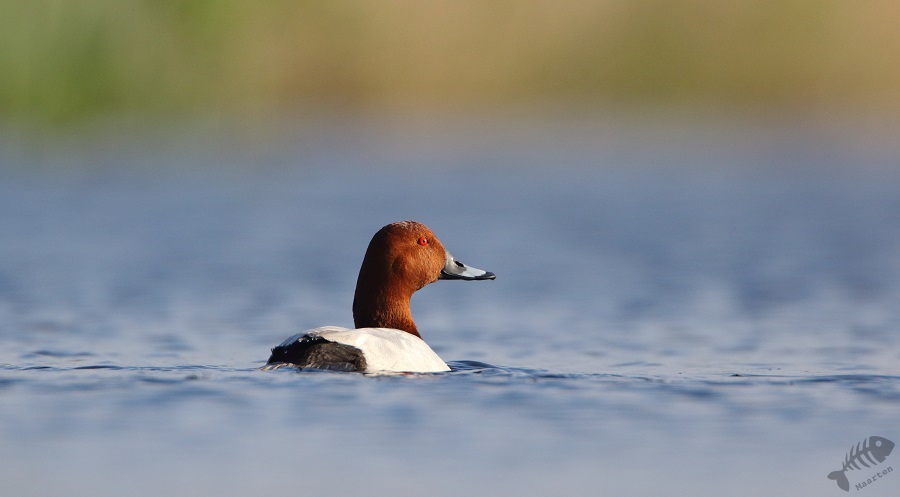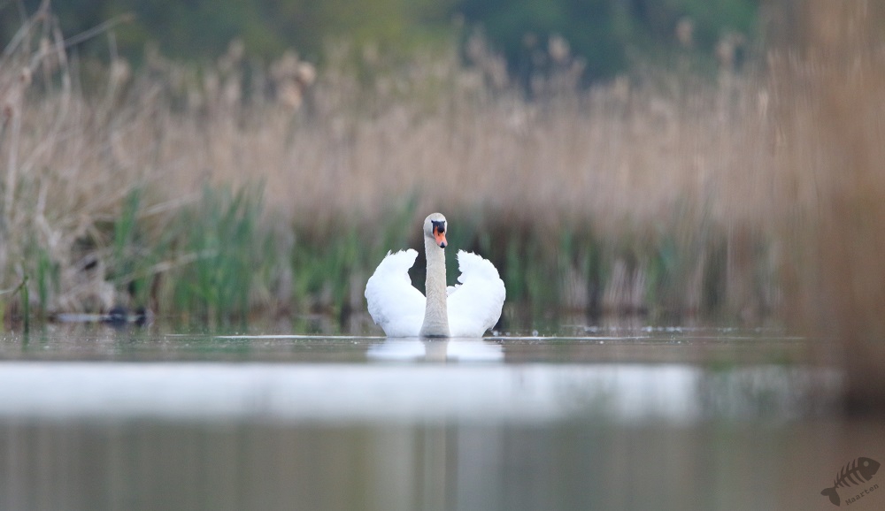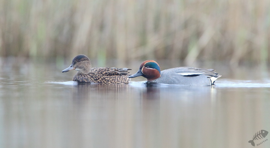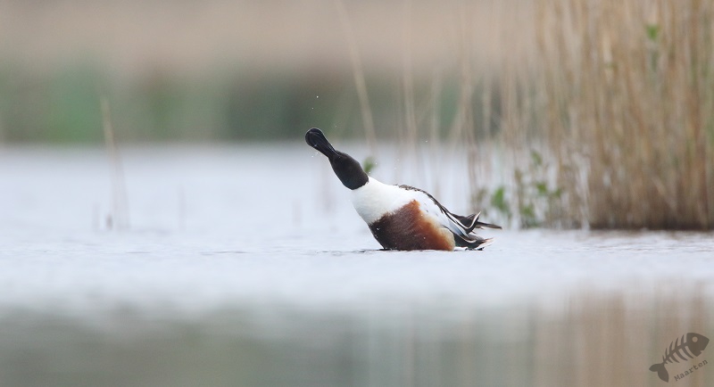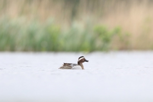 Het licht werd harder en op de plas voor de hut werd het steeds rustiger. Ik hoorde links en rechts uit het riet wel geluiden komen, maar de genen die deze geluiden maakten, lieten zich zelden zien. Er zat een geluid bij wat ik totaal niet kende. Het leek een beetje op een knorrend Varkentje, maar die verwachtte ik eigenlijk niet hier… Op een bepaald moment verscheen er een Zomertaling recht voor de hut en hij was volop bezig indruk te maken op de vrouwtjes. Op een bepaald moment opende hij zijn snavel, gooide zijn hoofd in zijn nek en deed dit vol overgave al knorrend! Hij, of de mannelijke helft van de Zomertalingen dus, zijn de makers van dit typische geluid. Ik had dus weer wat geleerd.