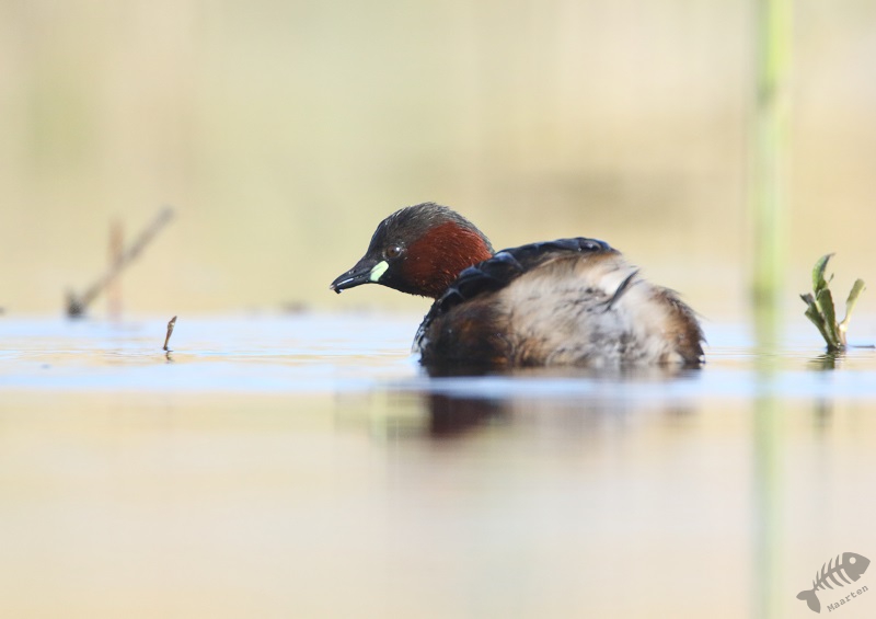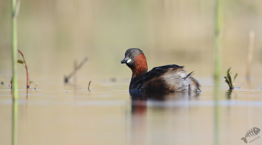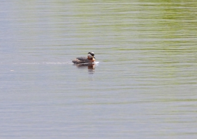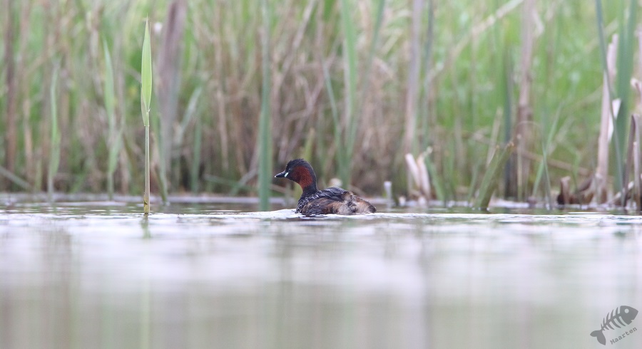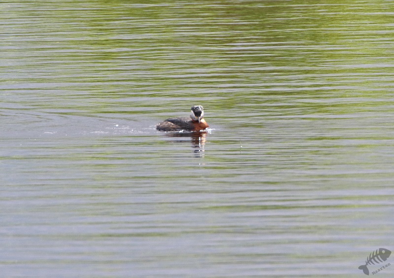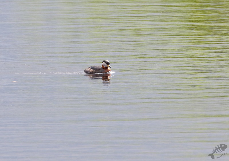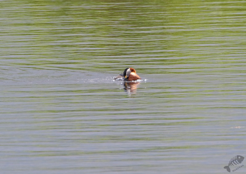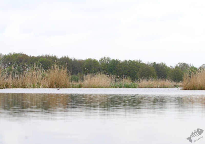 Op de plas bleef het rustig en de Roodhalsfuten lieten zich alsmaar niet zien. Ik besloot daarop rond 12 uur naar de openbare hut te gaan om te zien wat er vandaar allemaal te zien zou zijn. Er zaten 2 andere vogelaars waarvan er eentje vaker in Diependal kwam. Hij wist dan ook te vertellen dat de Futen op 2 andere plassen te zien zijn als degene voor de fotohut. Niet lang nadat hij dit verteld had, zag hij de eerste zwemmen en kregen we hem dus, van ver af, in beeld. Ik had de Roodhalsfuut! Even snel als hij verscheen, verdween hij ook weer en bleef het weer rustig. Het lukte me wel een Grasmus tijdens het wachten mooi in beeld te krijgen, ook weer té veel afstand, maar de Roodhalsfuut verscheen weer ten tonele, in mooi reflecterend licht en even daarna riep mijn hutgenoot dat er ook een exemplaar in de andere plas zwom en deze bleek richting ons te zwemmen.