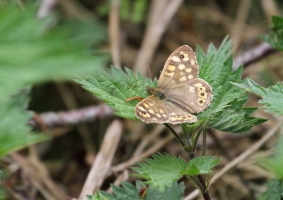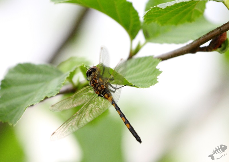 Weer bij de auto gekomen raakte ik nog aan de praat met enkele dames die er ook aan het vogelen waren en één van de vragen die tijdens zo’n gesprek in dit gebied steevast gesteld werd was: “heeft u ook Kraanvogels gezien?” Mijn antwoord daarop was hele tijd heel eenvoudig: “helaas, nee…” En terwijl ik dat ook tijdens dit gesprek liep te vertellen, hoorde ik een bekend getrompetter en vlogen er 2 Kraanvogels vrij laag over! Ik kreeg zelfs gelegenheid er verschillende foto’s van te maken, waarbij de donkere, dreigende achtergrond wel heel mooi meewerkte. Daarmee had ik toch het symbool van dit gebied te pakken! En omdat een Boompiepertje enorm z’n best zat te doen om tegen de wind in te zingen én een Venwitsnuitlibel (moest ik opzoeken…) zich maar net vast wist te houden in de wind, vond ik dat ik deze 2 helden ook nog even moest vastleggen.