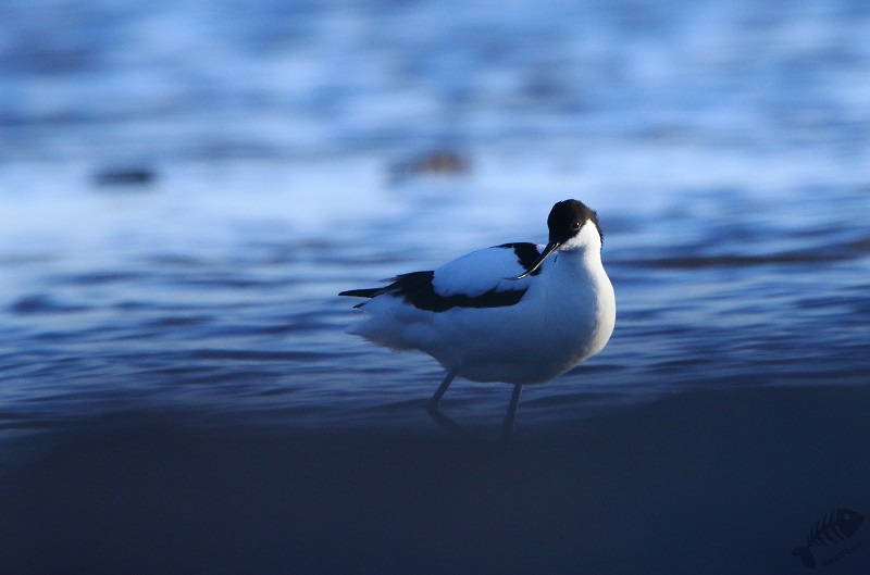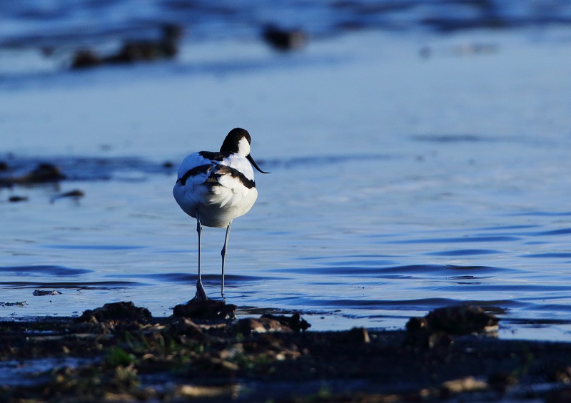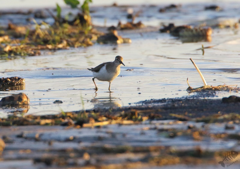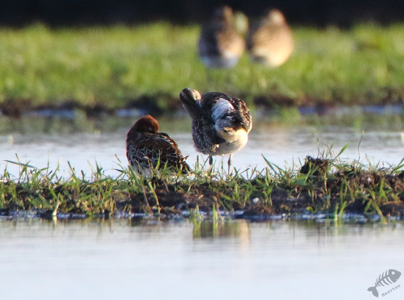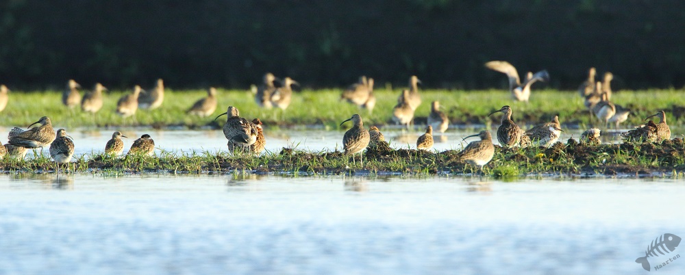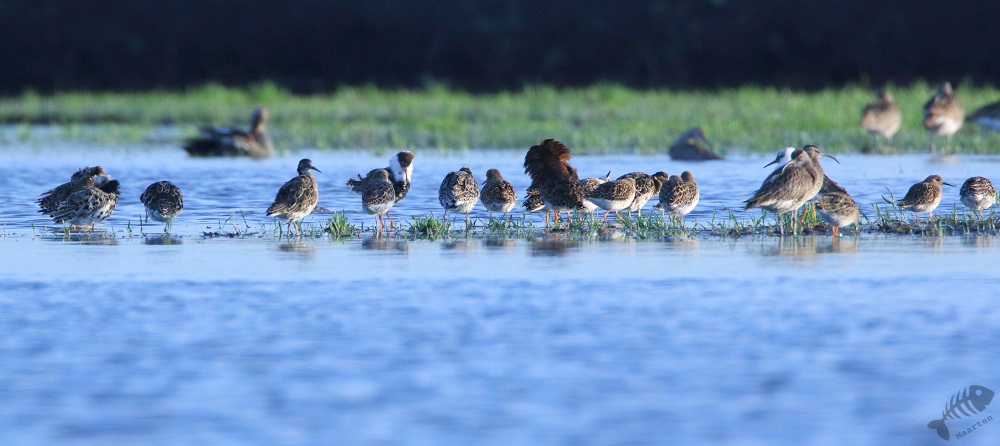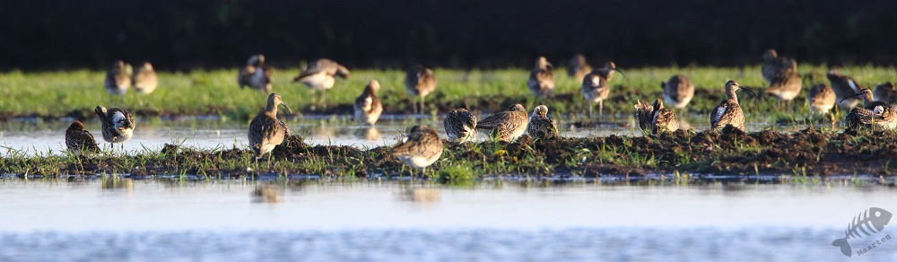 De avond erop heb ik weer een aantal andere afslagen genomen en zo stond ik ineens bij een plas met daaromheen een hoge dijk en aan de overkant een soort eilandje. Ik zag al snel dat hier veel vogels zaten en ben dus gestopt en heb de verrekijker erbij gepakt om het eens allemaal goed te bekijken. Ik zag Kieviten en Tureluurtjes, maar ook Kemphanen. In de Arkemheense polder zie ik hiervan vrij regelmatig vrouwtjes, of jonge mannetjes, maar hier zaten mannetjes bij in volle pracht! Zeker 2 verschillend gekleurde heerschappen waren te onderscheiden. De afstand was wel erg groot, en dat licht… Toen ik het allemaal door mijn camera bekeek om meer mannetjes te vinden, vond ik nog wat anders: er stonden ook behoorlijk wat Wulpen. Op één of andere manier dacht ik dat het geen gewone Wulpen waren, maar dan moesten het Regenwulpen zijn. Ik heb het later thuis eens rustig uitgezocht en ben er dus voor 99,99% zeker van dat… (lengte streep over de kop. Zie vergroting…)