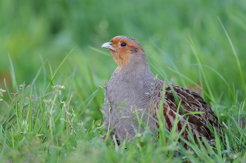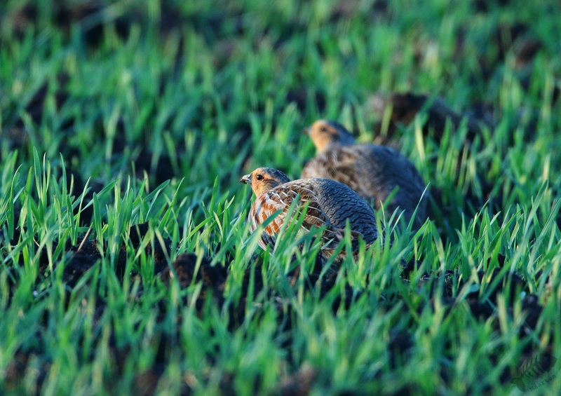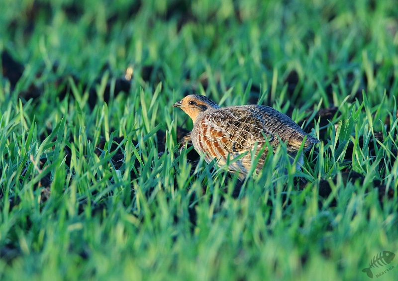 Op het moment dat ik weer wilde vertrekken, viel mijn oog nog op een Kluutje dat iets meer vooraan aan het foerageren was en op een Oeverlopertje die er ook rondscharrelde. Het werd tijd om weer te gaan en ik besloot mijn geluk weer te gaan beproeven bij de akker waar ik gisteren de Tapuit en het Paapje gezien had. Daarvoor kwam ik eerst langs een akker waar graan of maïs groeide en waar ik enkele bruine hoopjes op zag. Direct gingen bij mij de alarmbellen weer af. Hier, in Drenthe, op een uitgestrekte akker met begroeide bermen, bruine hoopjes? Dat moesten Patrijzen zijn. En dat waren het ook! Eindelijk trof ik ze weer. Het was inmiddels een hele tijd geleden en nu zag ik ze rondscharrelen op een manier zoals je zou wensen ze vaker te zien. Heel blij met deze vondst ben ik weer verder gereden en kwam bij de akker waar ik gisteren zo’n geluk had. Nu leek het uitgestorven, maar in de berm aan de andere kant van het weggetje zag ik vanuit mijn ooghoek weer zo’n bruin hoopje… Weer 2 Patrijzen! Het was Patrijzen-night! Het licht was nu ook wat mooier dan bij het eerste koppeltje, dus kreeg ik eindelijk de foto’s die deze prachtige vogels verdienen.