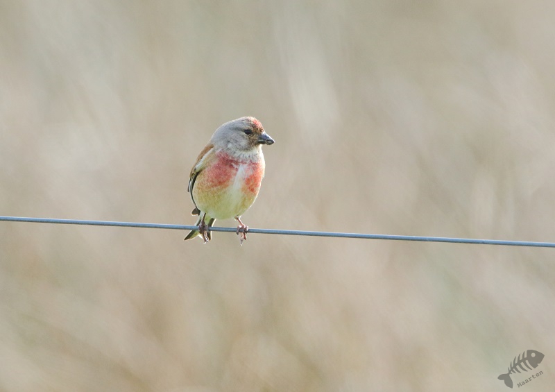 Toen we besloten hadden dat we de reis naar huis maar weer moesten aangaan, zagen we hoog in de verte een heel grote vogel vliegen. Er vloog een kleinere naast en we moesten echt even graven naar wat het zou kunnen zijn. Maar ineens kwam het antwoord: een Zeearend natuurlijk! Wat een enorme vogel was dat in vergelijking met de Buizerd die bij hem vloog. Dit was toch wel het gepaste einde van een mooie dag. We zijn weer in de auto gestapt en richting huis gereden, maar… Net voorbij het bezoekerscentrum, op de draad, kregen we weer een heel mooi Paapje in beeld. Hier moesten we wel even voor stoppen… En omdat een Kneutje ook altijd leuk is, heb ik hier ook nog even een fotootje van gemaakt en daarmee was het wel helemaal klaar.